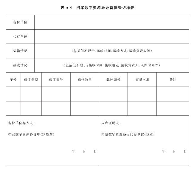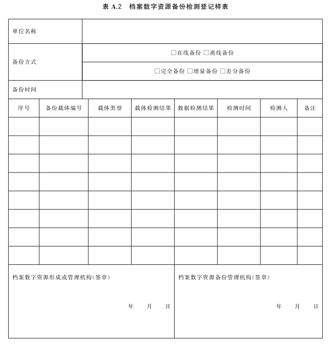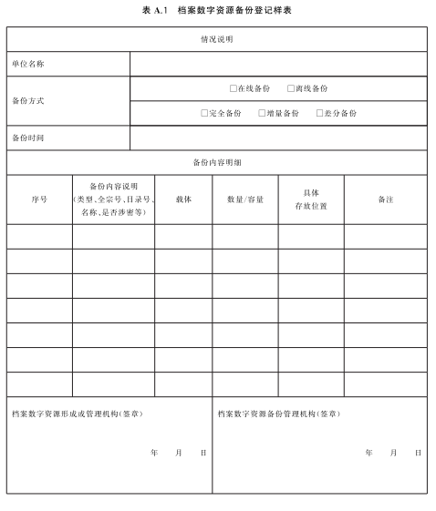 表 A.1~表 A.4给出了档案数字资源备份工作常用表单样表,分别为档案数字资源备份登记样表、档案数字资源备份检测登记样表、档案数字资源备份数据销毁登记样表、档案数字资源异地备份登记样表。在开展档案数字资源备份工作时所使用的表单可结合实际情况进行调整。