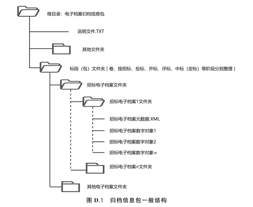 图 D.1中,标段(包)文件夹,以卷为单位组织文件夹,卷内为电子档案组合,按招标、投标、开标、评标、中标(定标)等阶段分别整理。