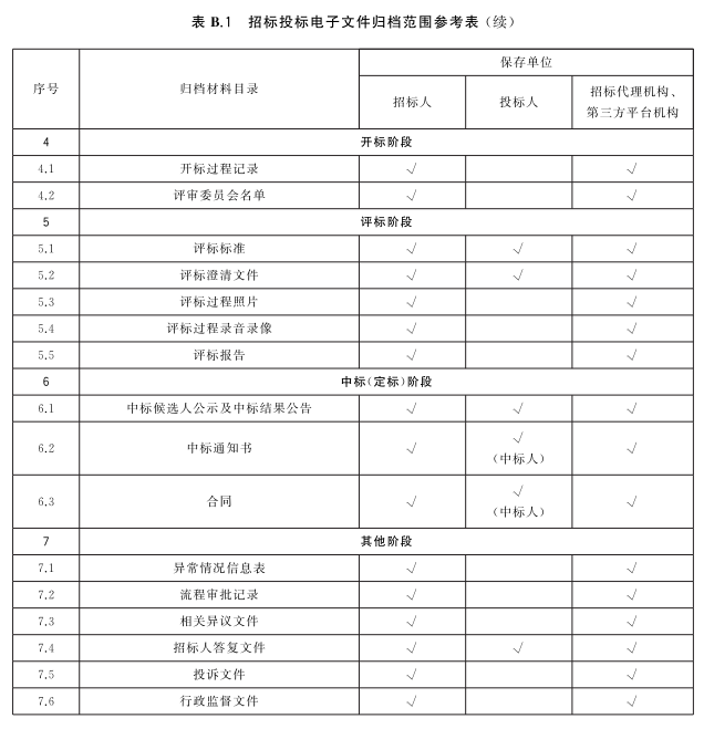 表 B.1给出了招标投标电子文件归档范围参考表。