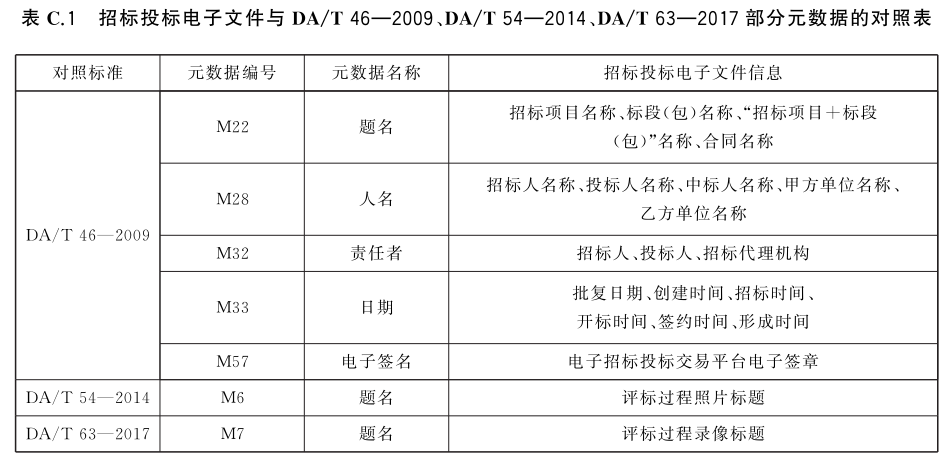 表 C.1 给出了招标投标电子文件与 DA/T46—2009、DA/T54—2014、DA/T63—2017部分元数据的对照表。