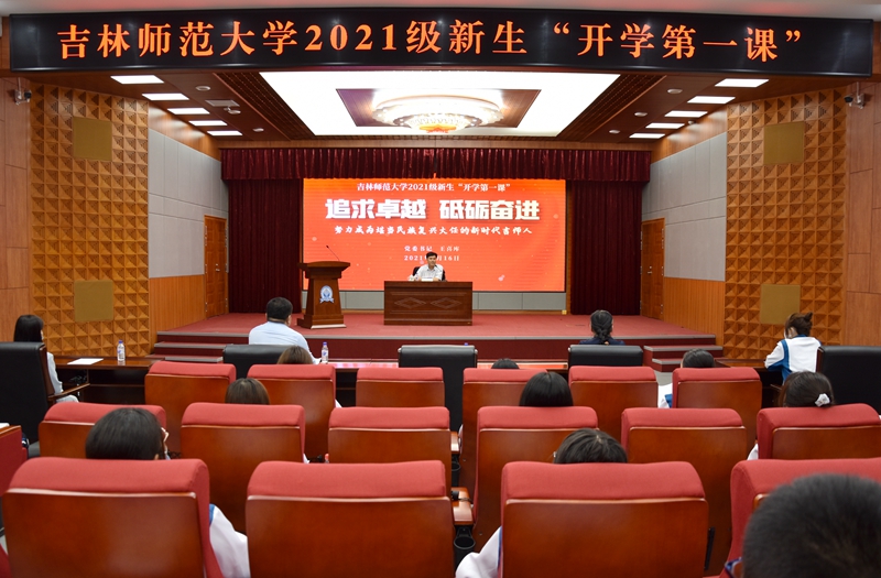 9月16日,校党委书记王喜库以《追求卓越 砥砺奋进 努力成为堪当民族复兴大任的新时代吉师人》为题为2021级新生讲授“开学第一课”暨思政课首讲。授课采取线上和线下相结合的方式进行,相关部门负责人、全体2021级新生4000余人聆听报告。