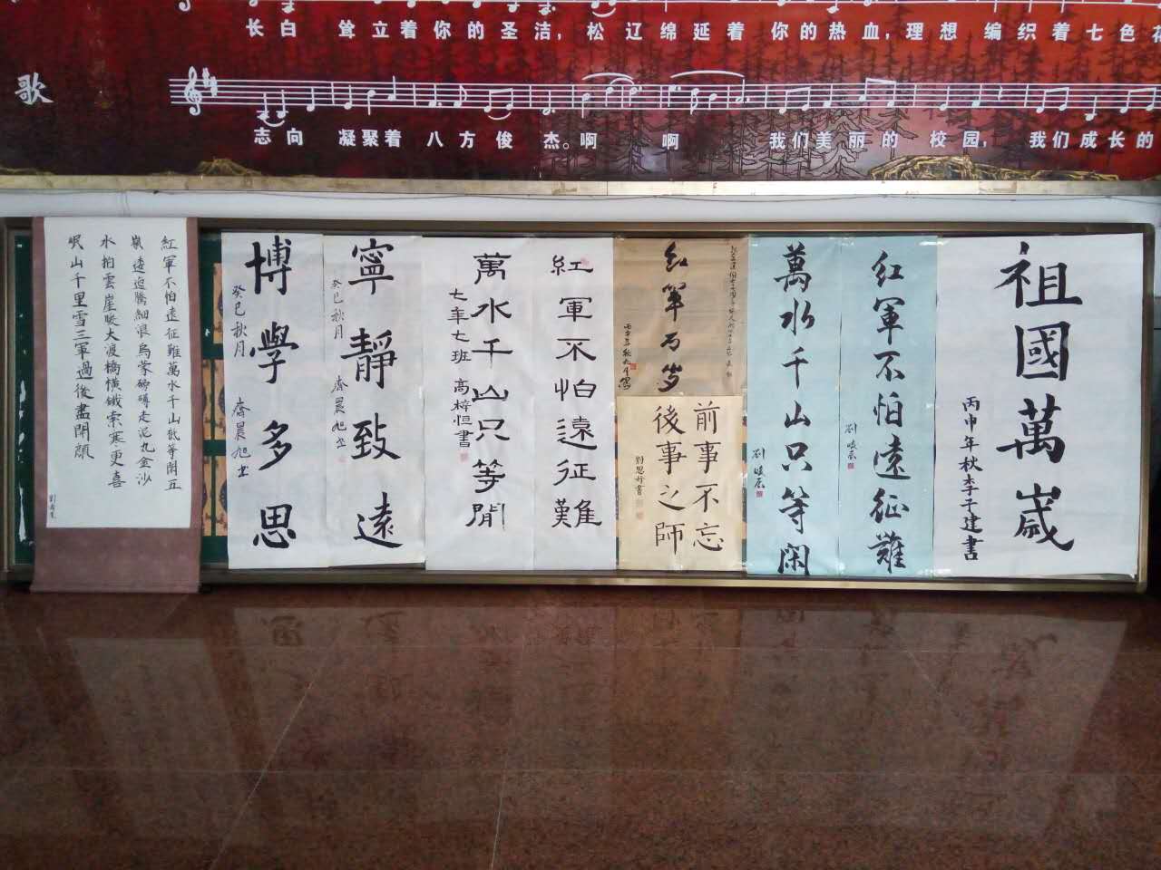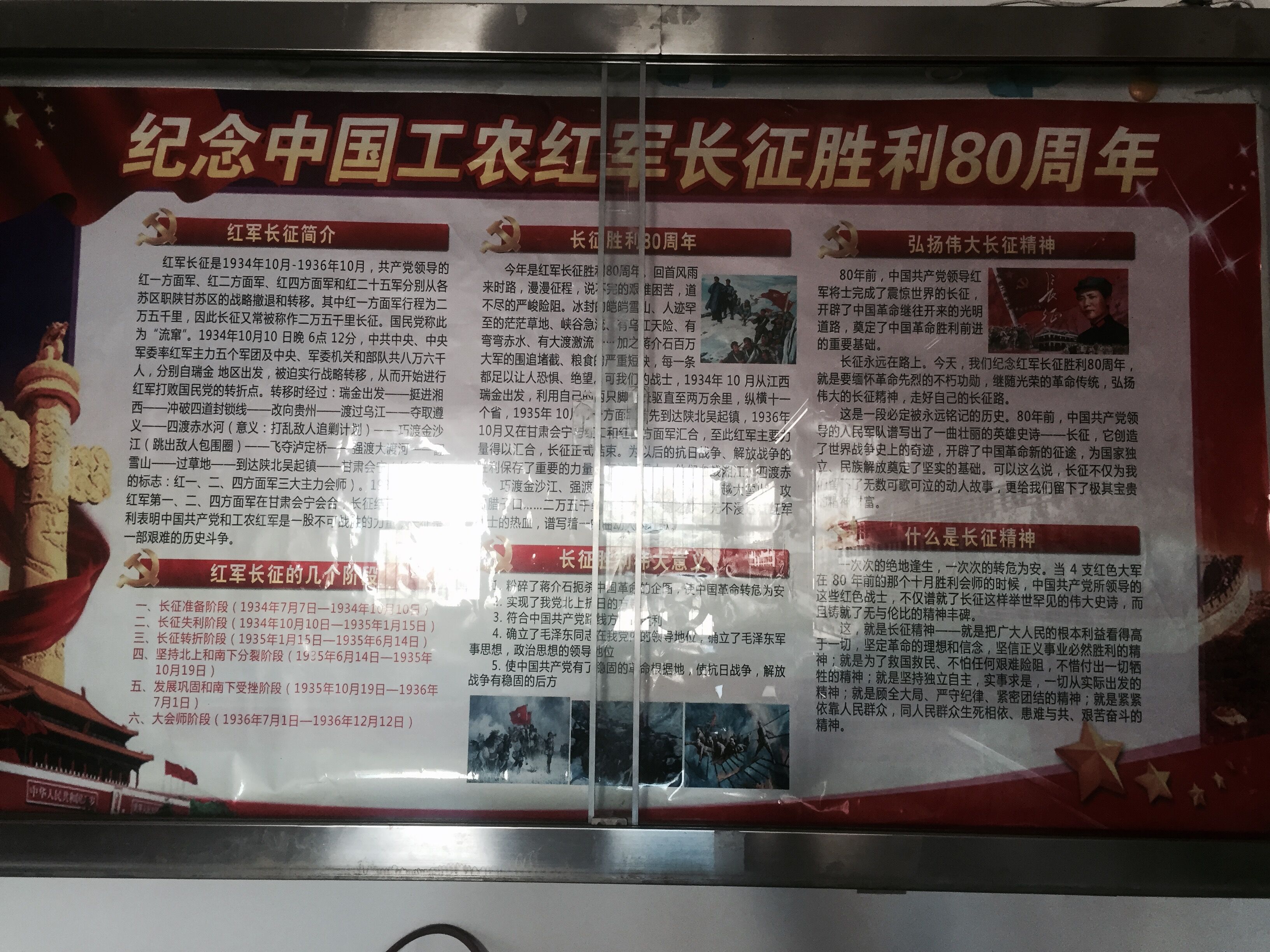 在教学楼内橱窗里宣传红军长征事迹,让学生们真实了解中国历史上的这一段的故事,感受今天的生活是多么的来之不易的,激发学生珍惜今天,珍惜生活,珍惜命运的思想。