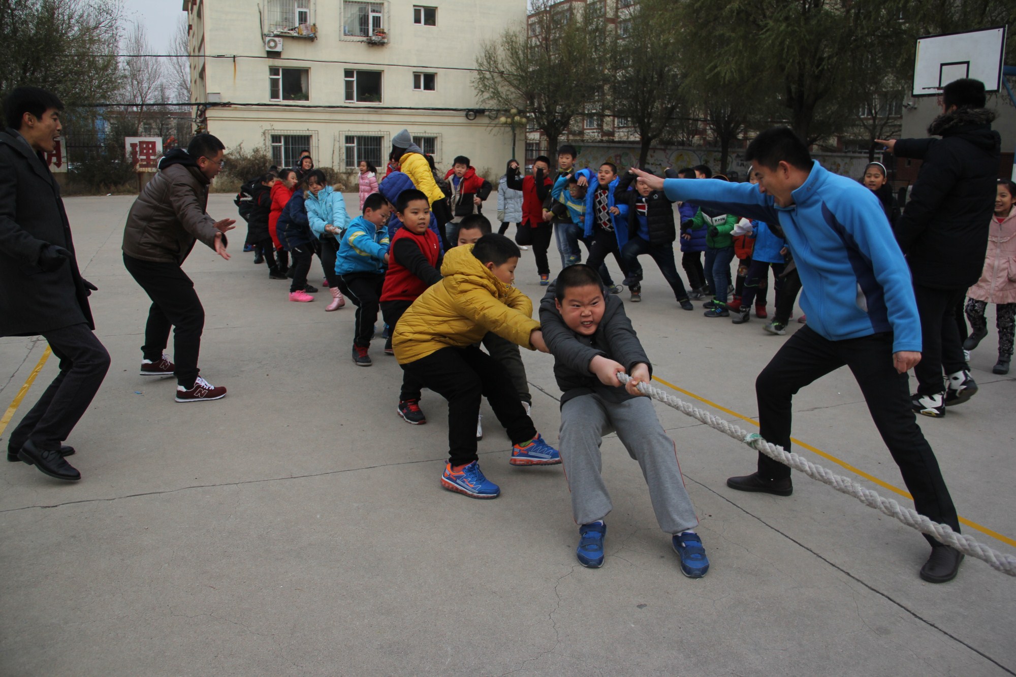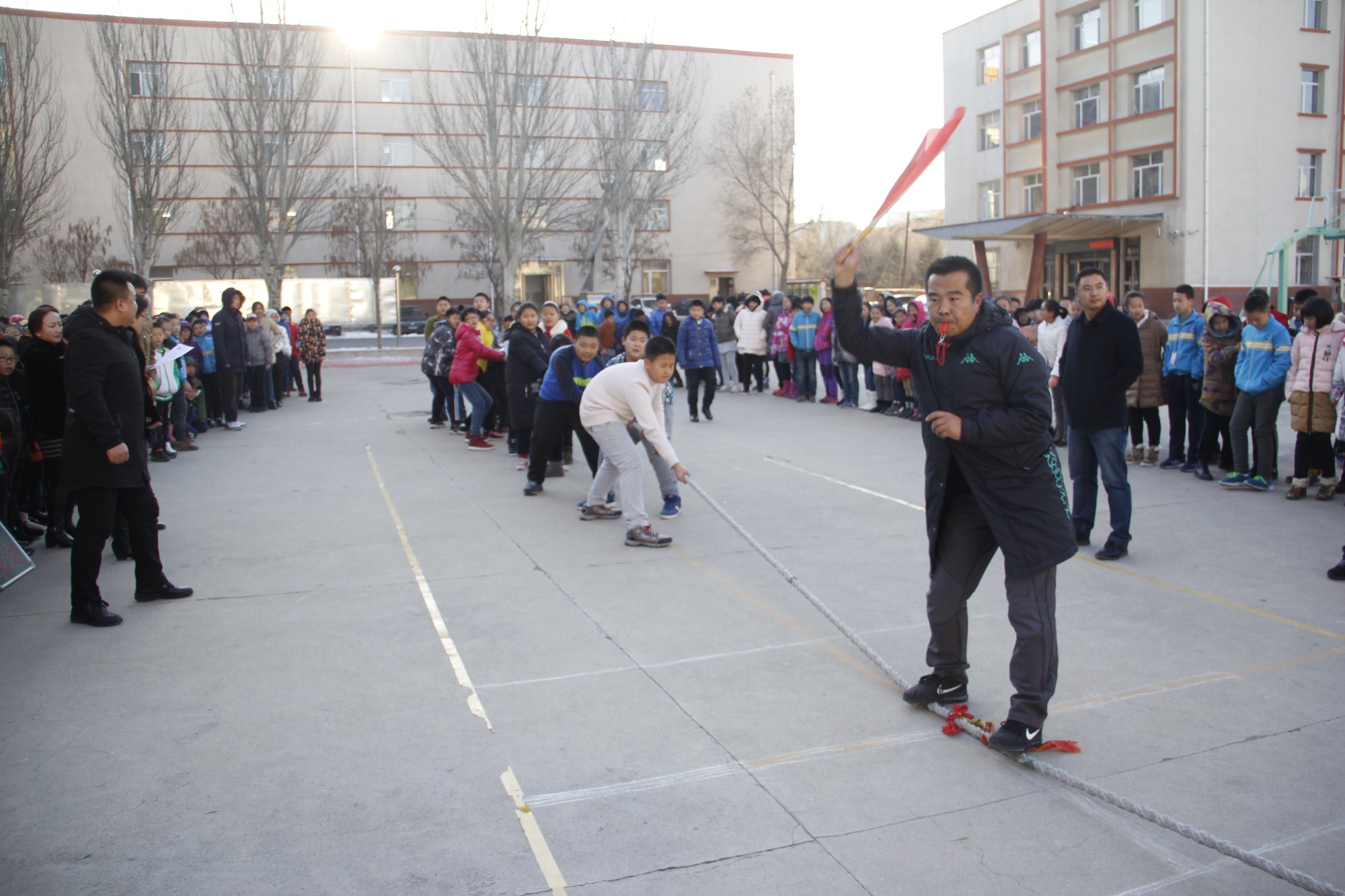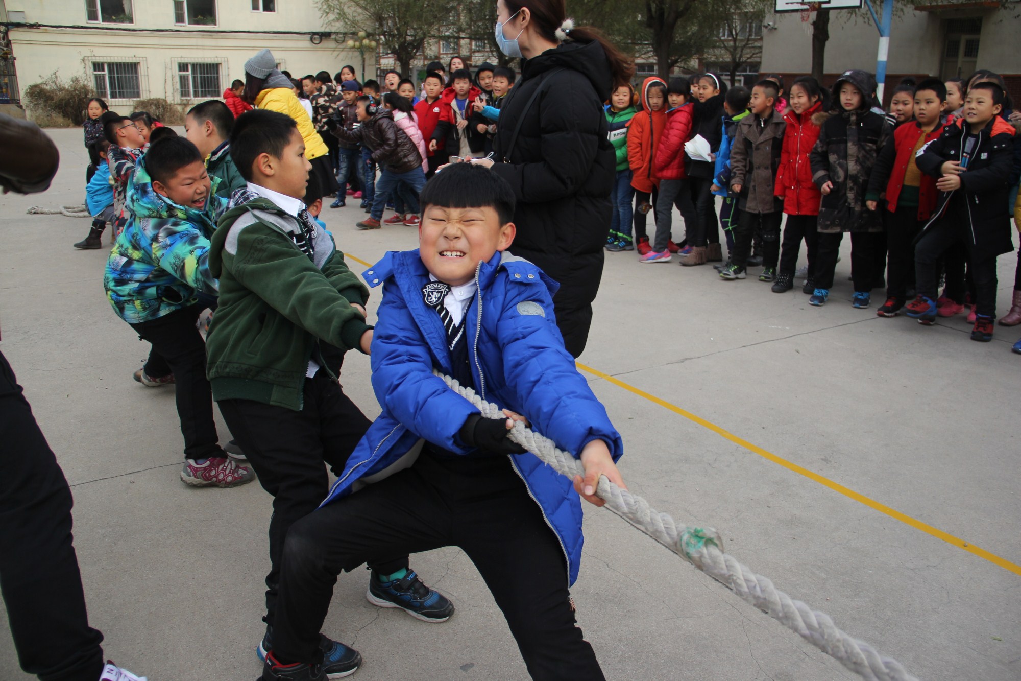 “加油!加油!”在啦啦队同学震耳欲聋的呐喊声中,参赛队员卯足了劲,抓紧了绳,奋力拼搏。遇到两队实力相当时,比赛更加激烈,扣人心弦,只见绳子中间的红色标志来回地移动,难分胜负。