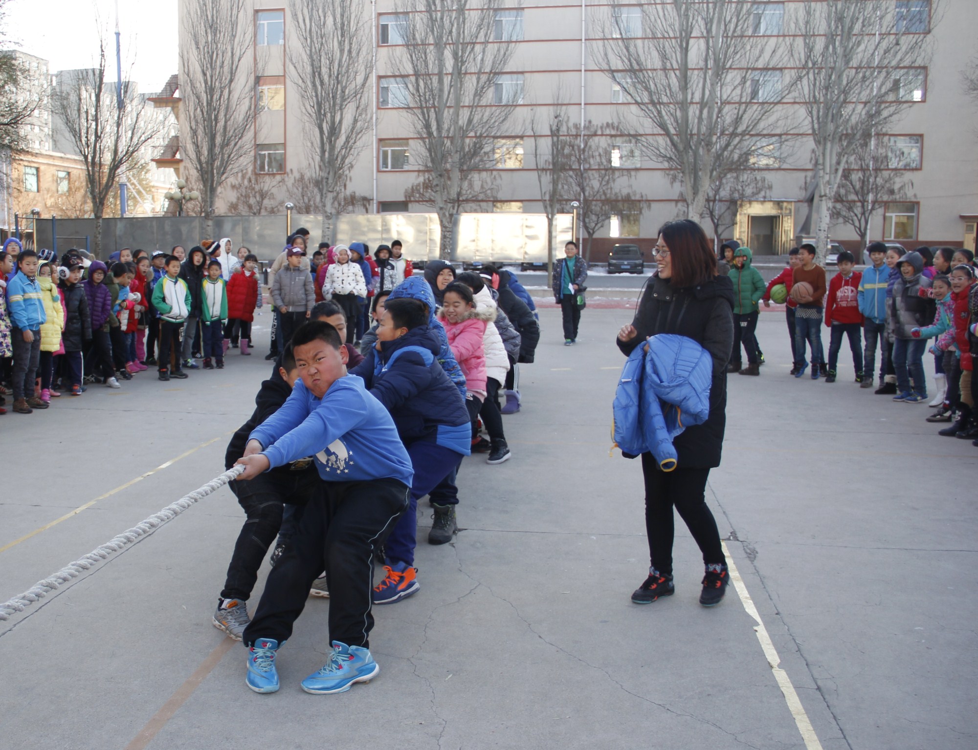 本次比赛以班级为单位,选出7女8男参赛,采取抽签分组循环比赛的办法。在比赛中,每个班级的参赛队员个个精神饱满,热血沸腾,在老师的指导下,参赛队员们在绳子两边准备就绪。随着裁判长一声令下,两队队员迅速进入“战斗”状态,比赛正式开始。