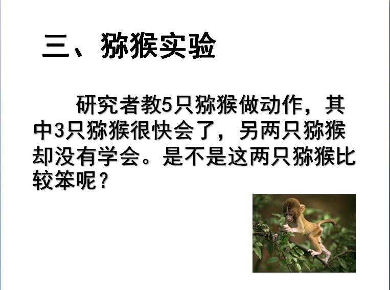 “猕猴实验”更是说明,其实每个学生的聪明程度相差不大,只要教师以一种平和的教育智慧原谅学生目前的落后,充分发现学生的特点,挖掘其亮点,并找到适合学生的教育教学方法,因材施教,相信定会成就学生日后的优秀。