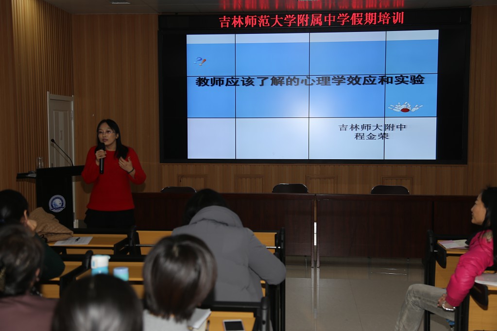 现代教育要求教师应该多了解心理学知识,在对学生的教育中应采用更符合中学生心理特点的教育方式,以此提高工作成效,获得学生爱戴,1月8日下午2:20分,吉林师大附中学生发展促进中心主任程金荣在阶梯教室与大家共同分享了“教师应该了解的心理学效应和实验”。