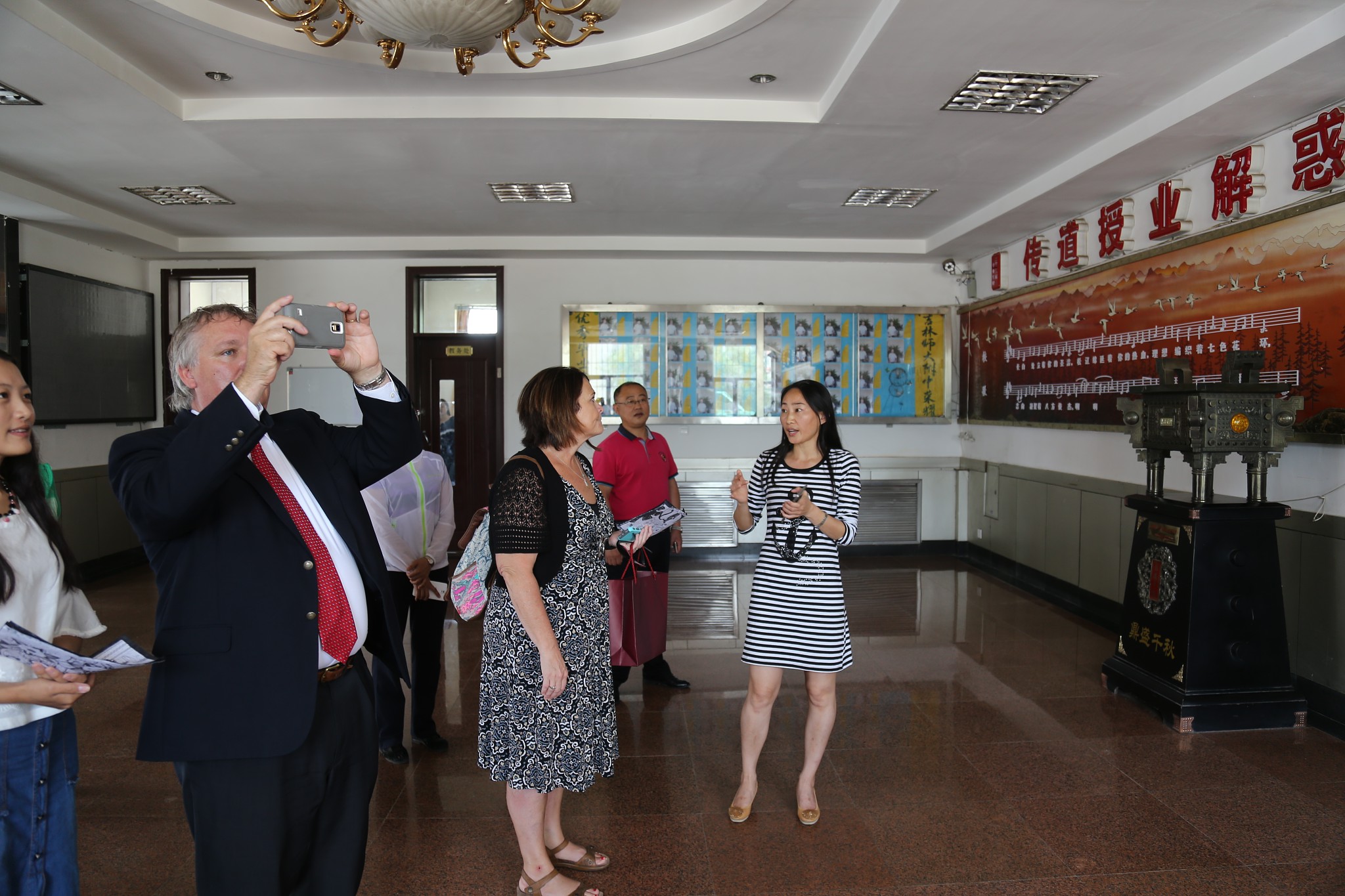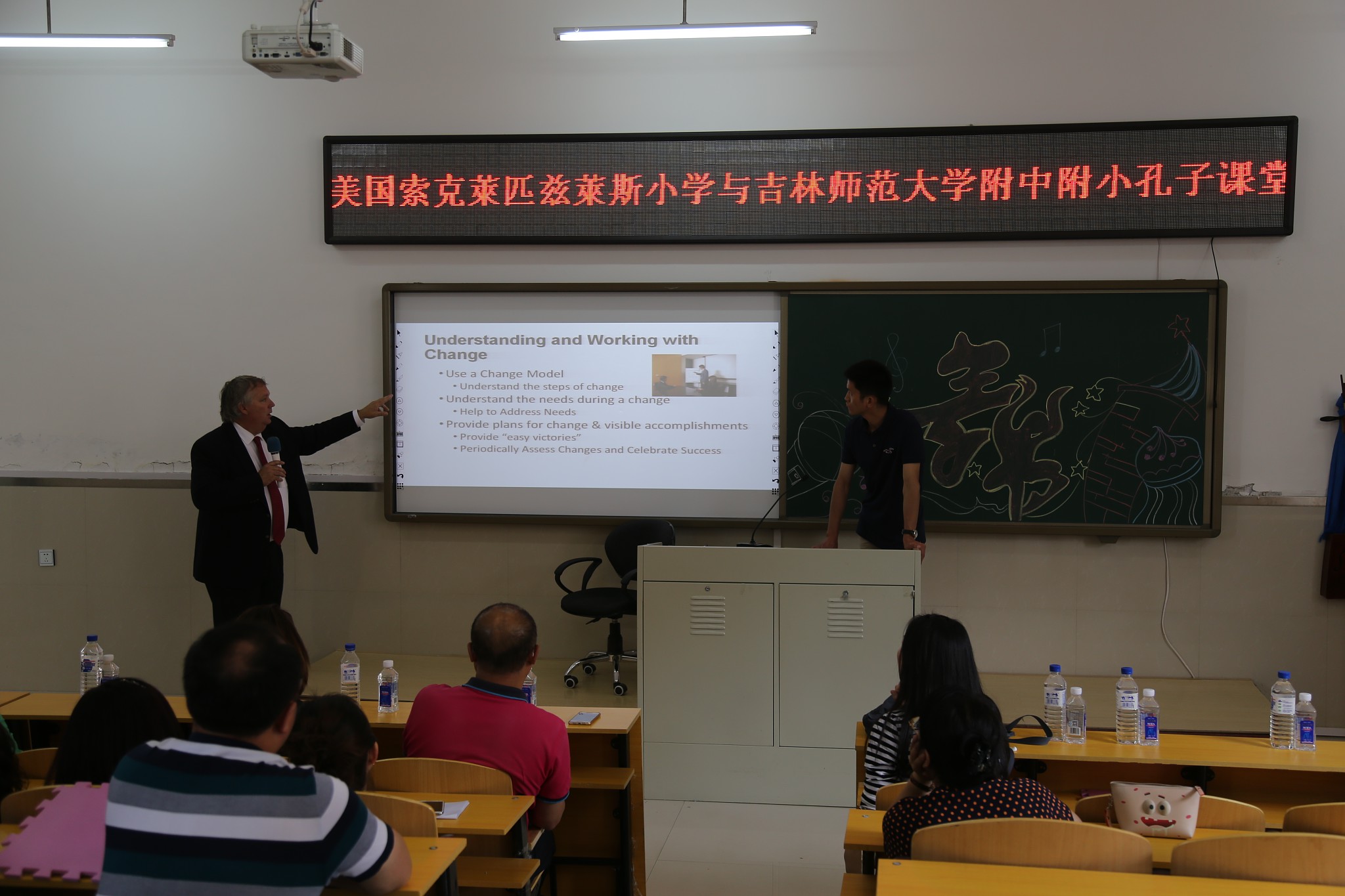 接着,John教授在综合楼阶梯教室,为太阳成官网中层以上领导干部做了一节题为“在新形势下如何做一位好校长”的专题讲座。指出校长要和老师之间建立和谐平等的人际关系,校长要多与老师交流讨论;同时指出教师在教学的过程中要注意教育的生成与反思,强调新教师要多向有经验的教师学习,勤沟通,多做反馈。John教授的讲座,使太阳成官网中层干部,了解了美国的教育理念、教育模式和管理经验,在思想上上了一个新台阶。