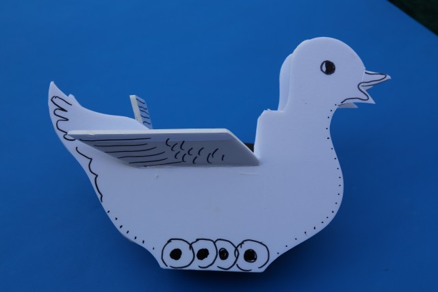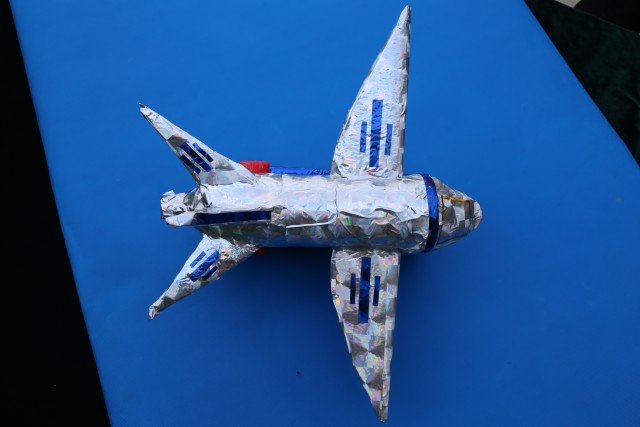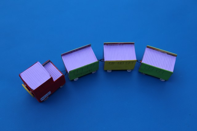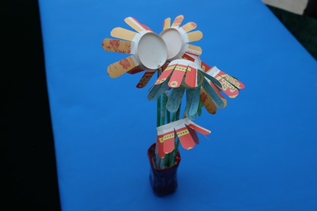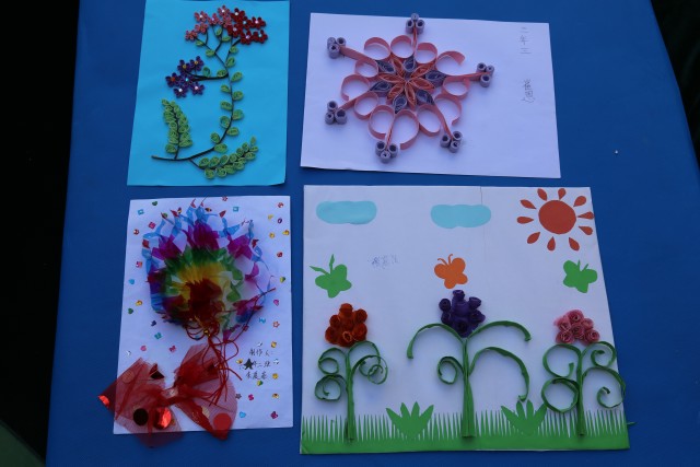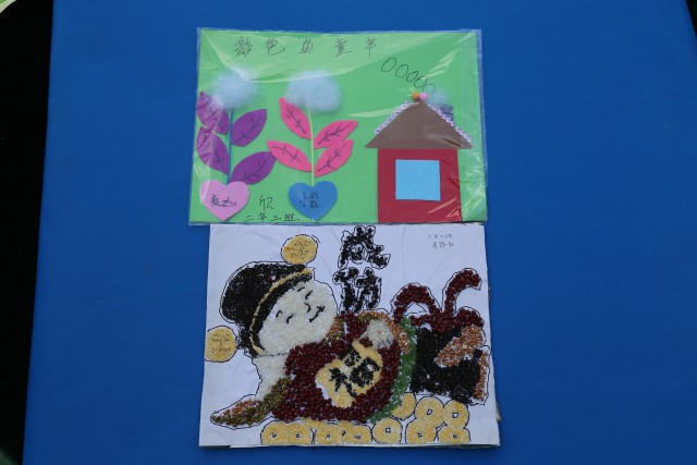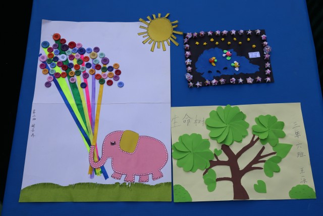孩子们充分发挥自己的创造力和动手能力,将各种纸盒制成坦克、小火车;用彩纸、黏土、豆粒汇成一幅幅精美的画面;还有的同学使泡沫板变成了洁白的和平鸽;废弃的光盘加上简单的装饰则成了漂亮的时钟……