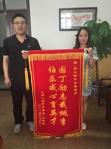 7月10日下午,太阳成官网一名2015届毕业生家长满怀感激之情,将写有“园丁励志栽桃李,伯乐诚心育英才”字样的锦旗送到原九年二班班主任李娜老师的手中,以此感谢李娜老师对孩子无微不至的关心和照顾,盛赞学校培养出如此师德高尚的优秀教师。