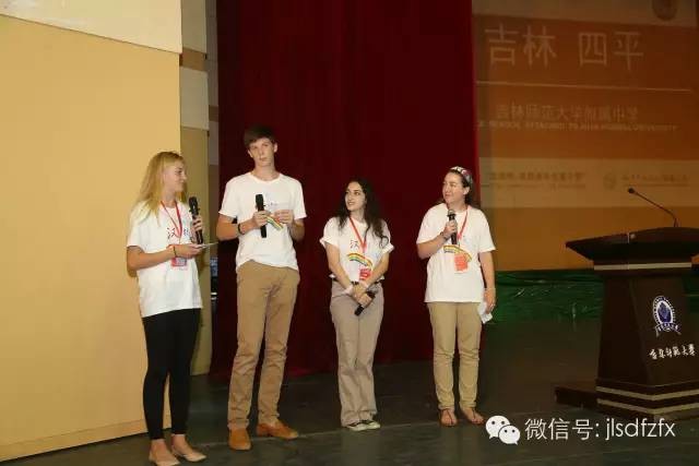 美国学生代表和吉林师大附中学生代表分别发言。美国学生用并不熟练的汉语表达了来到四平、来到吉林师大附中的兴奋,感谢附中为其提供的活动和照顾,他们很喜欢我们的中国菜,很期待接下来的活动,很高兴学习中国汉语和中国文化。附中学生代表表示,很高兴美国师生的到来,并为来访师生介绍了附中现状,希望他们在接下来的日子里能够开心快乐,附中学生与其建立的友谊能够地久天长。
