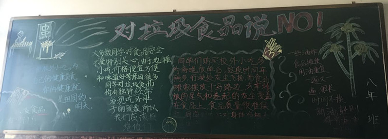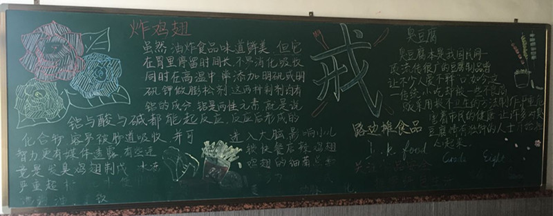 附中团委为加深食品安全的宣传力度,着力提高学生的自我保护能力和卫生防病意识,也积极开展食品安全知识宣传教育,围绕垃圾食品的危害及远离垃圾食品制作黑板报,呼吁学生一起行动起来,告别垃圾食品,做健康少年。