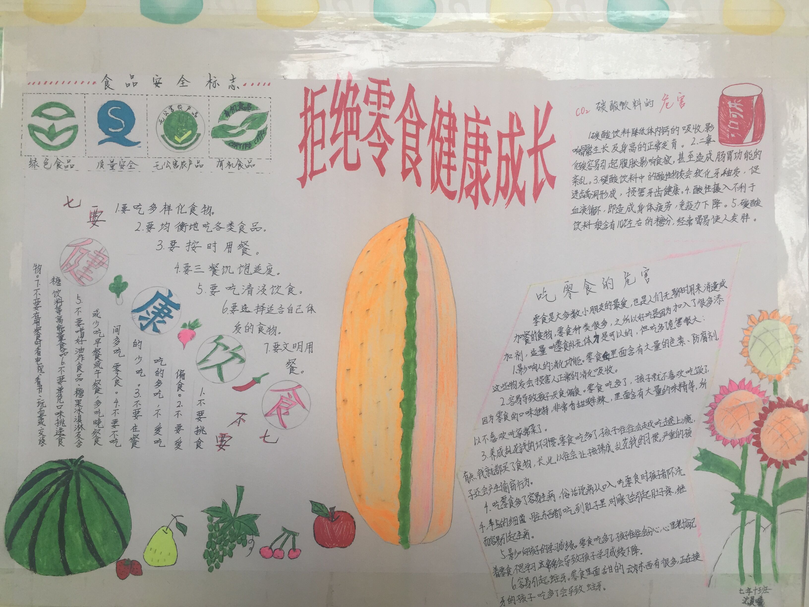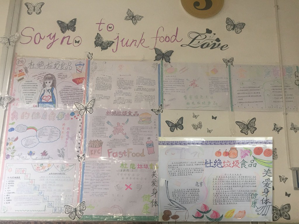 为保障学生的身心健康,强化学生对食品安全的认识,使学生真正做到远离垃圾食品,4月初,吉林师大附中政教处,在七、八年级举办了以“拒绝垃圾食品 健康从我做起”为主题的健康教育手抄报评比活动。