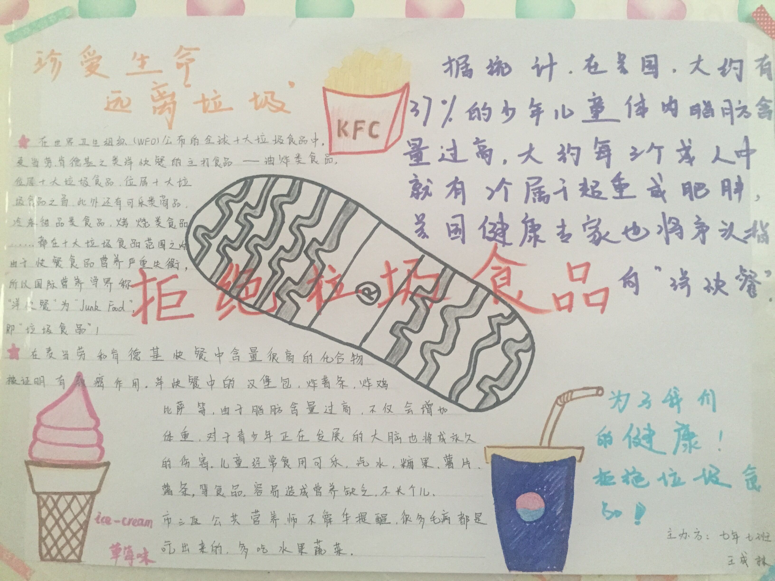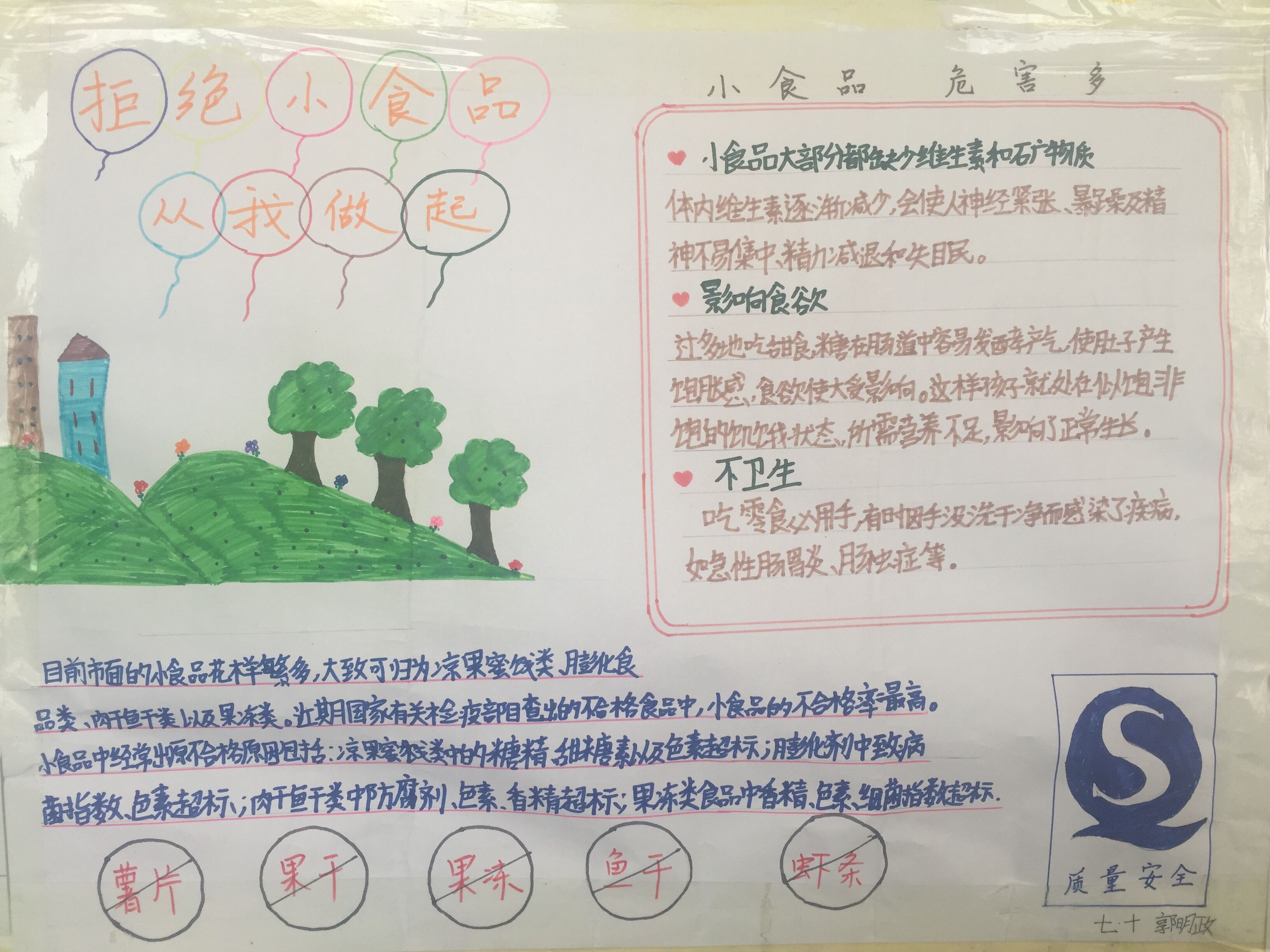 同学们通过查阅相关书籍、搜索网络资源等多种方式搜集食品安全常识及垃圾食品危害等手抄报素材,再通过自己的精心构思,设计出一幅幅内容丰富、插图精美的手抄报,号召学生养成良好的饮食习惯和健康的生活方式,倡议学生从自身做起、从身边小事做起,坚决杜绝垃圾食品。