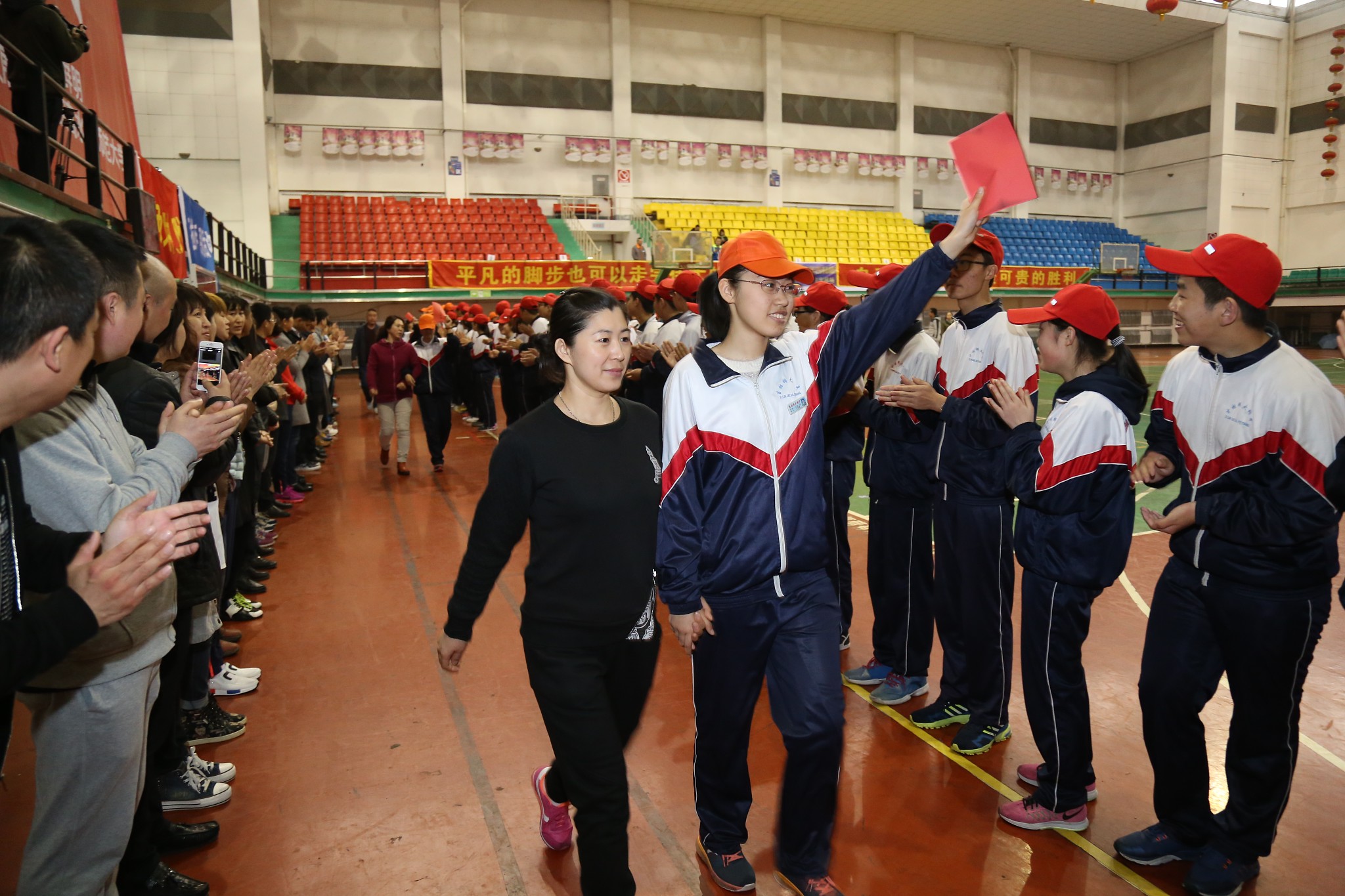 活动项目以“破冰之旅”为引领,学生和家长共同模拟中考成功后,学生手拿梦寐以求的高中入取通知书,和家长一起并肩携手走过“T”台,接受队员的祝贺,感受成功的喜悦。他们一起加油,一起欢呼,相互勉励,再次坚定了决胜中考的信•心。
