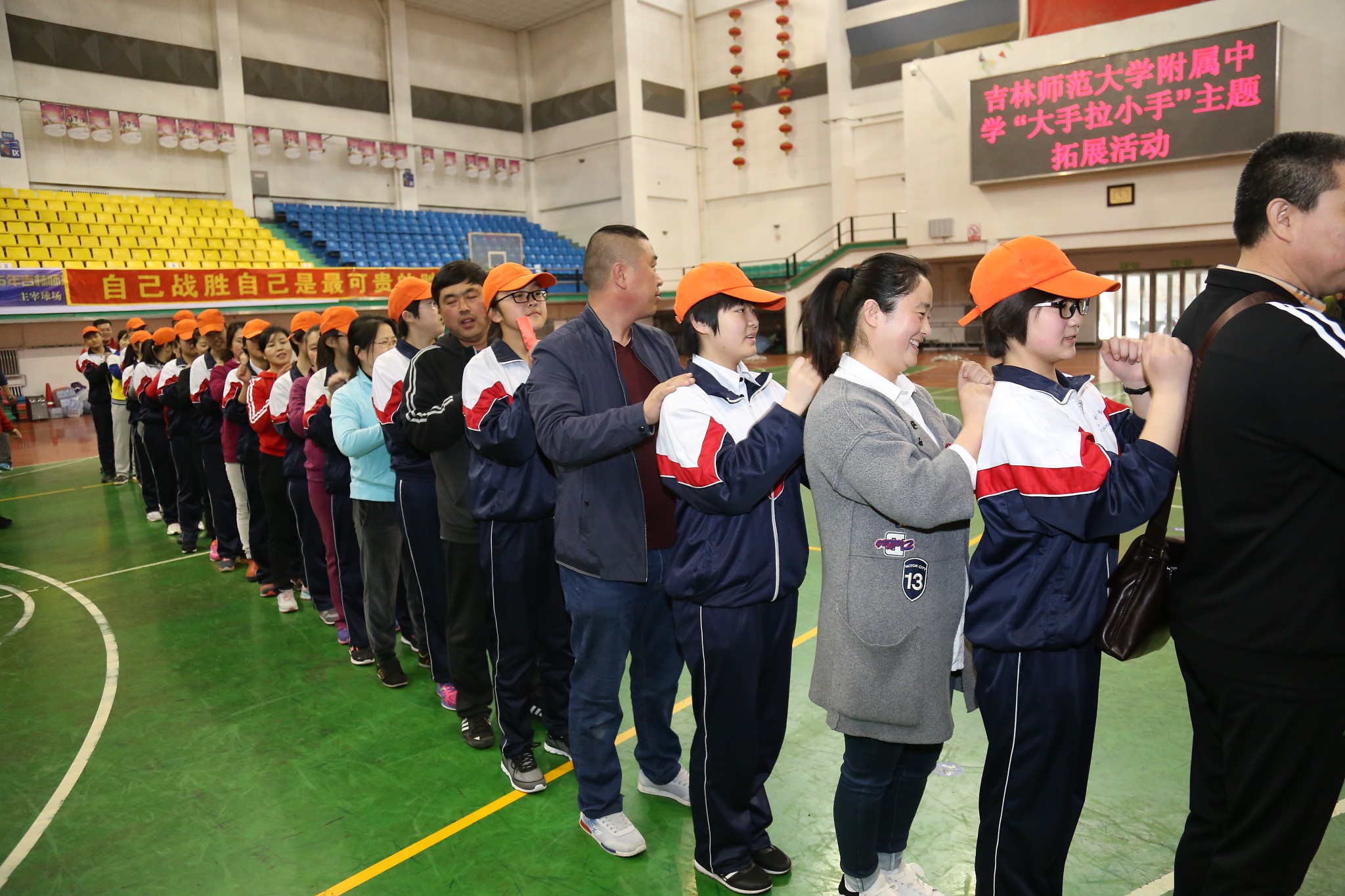 为了增进学生与父母之间的交流与理解,让学生学会感恩、合作与坚持,并能以阳光的心态直面中考挑战,4月17日上午8:30分,吉林师大附中科研处与政教处、心理咨询室等部门通力协作,举办了“大手拉小手”主题拓展实践活动。拓展活动邀请了九年级100名学生及100位学生家长共同参加,吉林师大附中附小校长李峰、副校长孙阳华,附中副校长闵红佳出席活动。活动全程由心理咨询室主任程金荣主持。