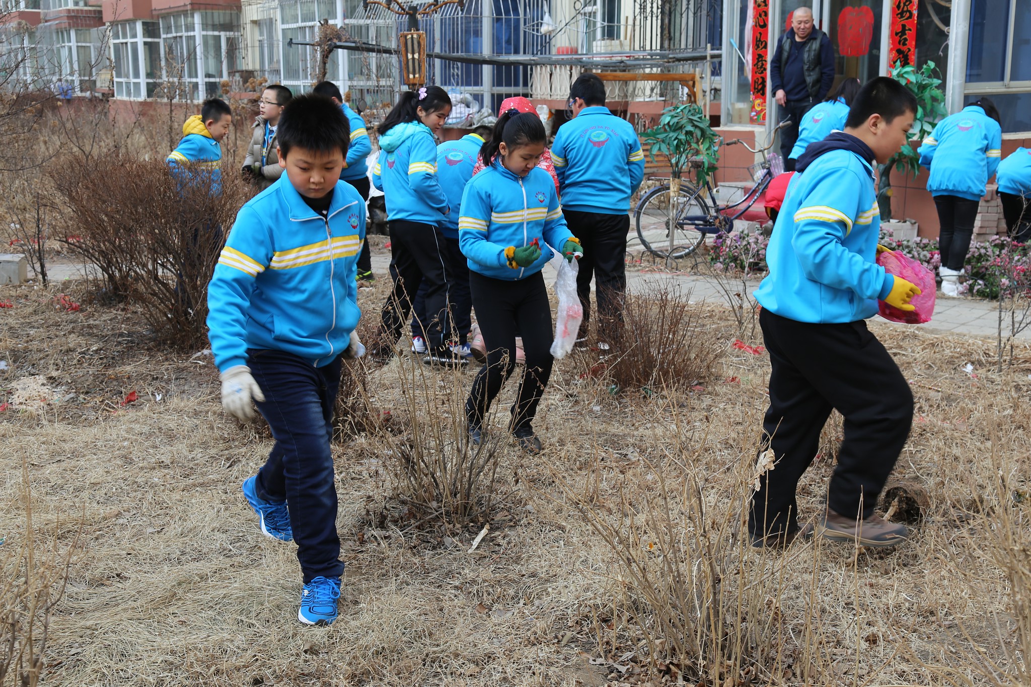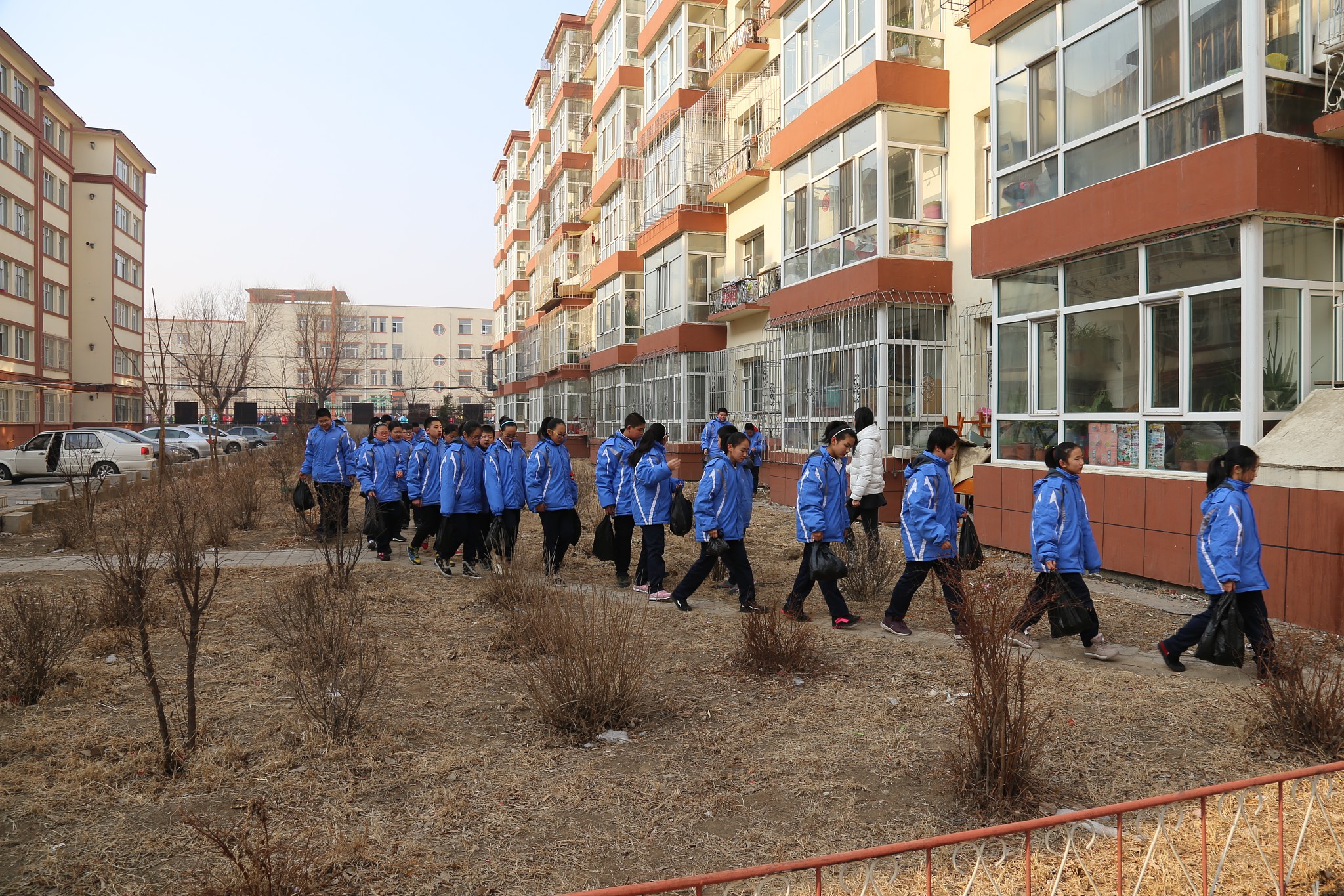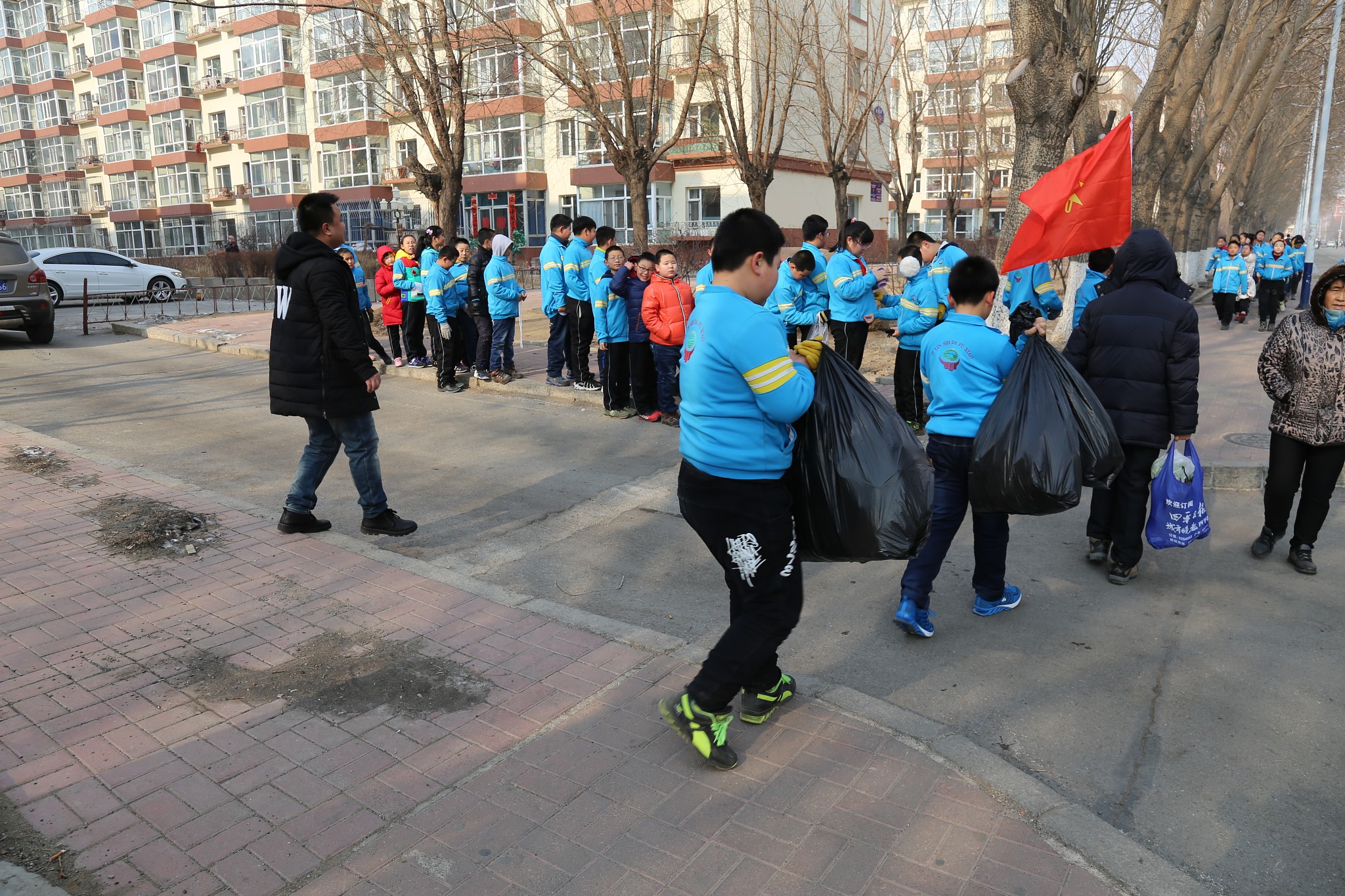 在团委书记刘丽娜、大队辅导员董君的带领下,学生们不畏严寒,着装整齐,高举团旗、队旗步行来到吉林师大社区。在社区负责人的指引下,同学们分成两个小组沿着小区的外墙、甬路、树丛捡拾起白色垃圾,开始了清扫活动。虽然天气特别寒冷,但学生们的劳动热情丝毫不减,他们不怕脏不怕累、任劳任怨、一丝不苟的清捡着小区里的烟头、塑料袋、纸屑等白色垃圾。