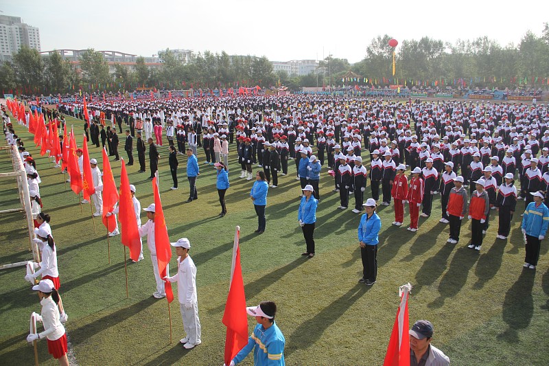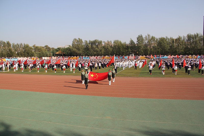 17日8时整,在激昂雄壮的进行曲中,国旗队、花束队、旗海队、运动员代表队依次走过主席台接受大会检阅。各方阵步伐整齐、口号响亮,充分体现了当代中学生的青春与活力。随后,举行了庄严的升旗仪式。在雄壮的国歌声中,鲜艳的五星红旗在师生们的注视下冉冉升起。