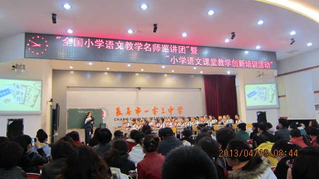 4月12日上午由《中国教育台》名师大课堂主讲人吉春亚教师讲了一节语文课——《凤辣子初见林黛玉》,随后吉老师又做了一节题为《运用是最好的语文》的讲座。下午由北京市东城区教育研修学院语文教研员吴琳老师讲了80分钟的语文课《生命 生命》,随后对新课标进行部分解读。