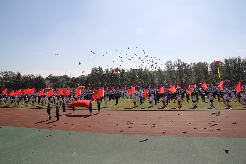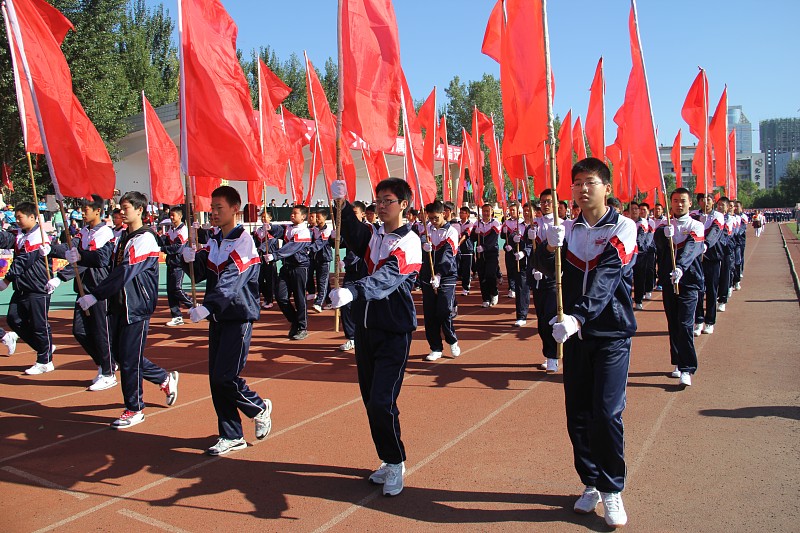 14日8时整,在激昂雄壮的进行曲中,国旗队、花束队、旗海队、运动员代表队依次走过主席台接受大会检阅。各方阵步伐整齐、口号响亮,充分体现了当代中学生的青春与活力。随后,举行了庄严的升旗仪式。在雄壮的国歌声中,鲜艳的五星红旗在师生们的注视下冉冉升起。
