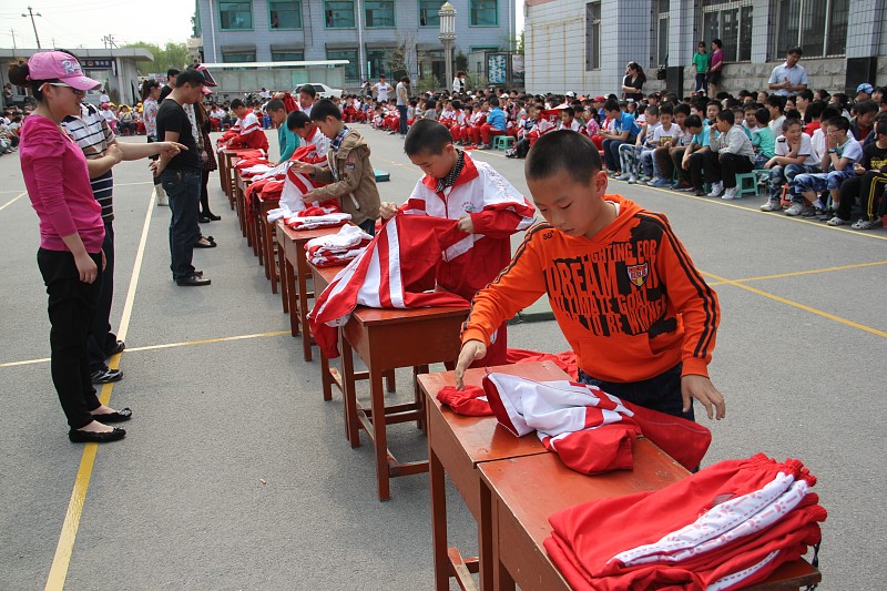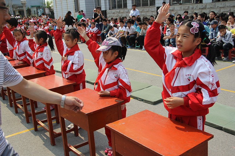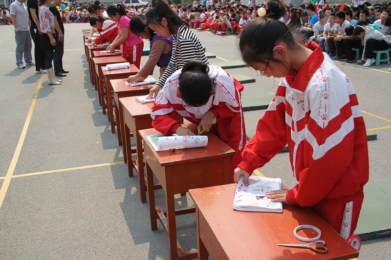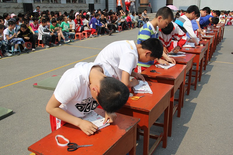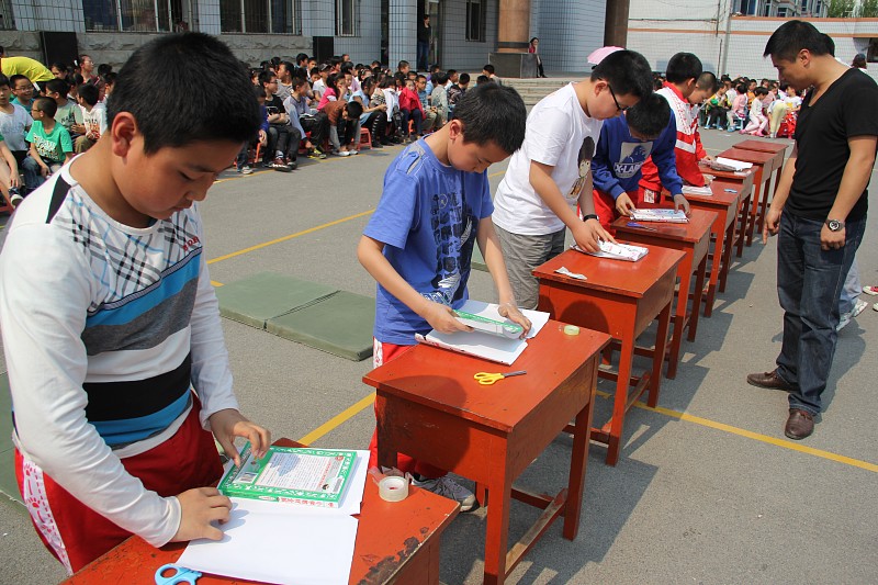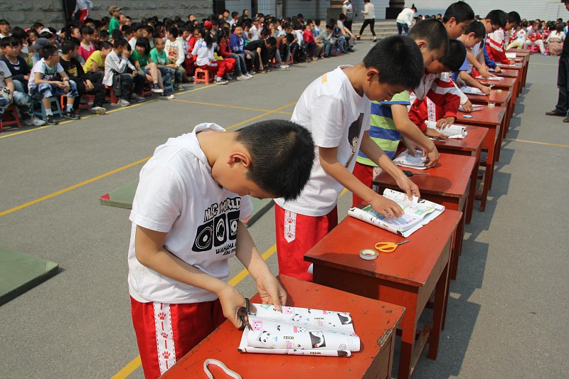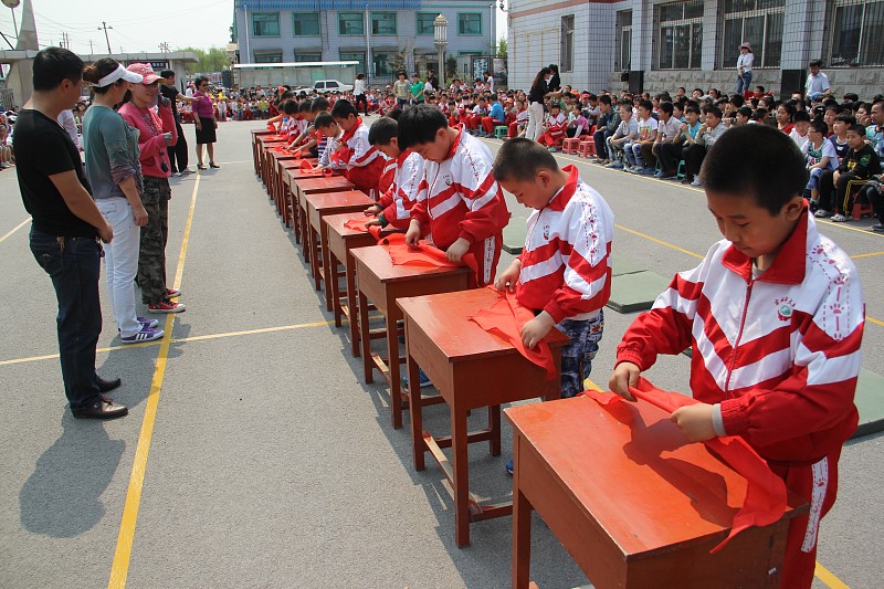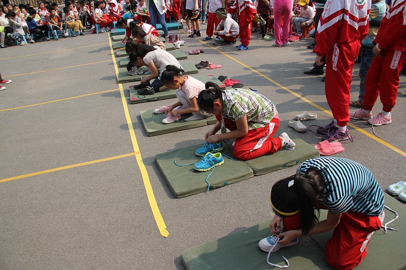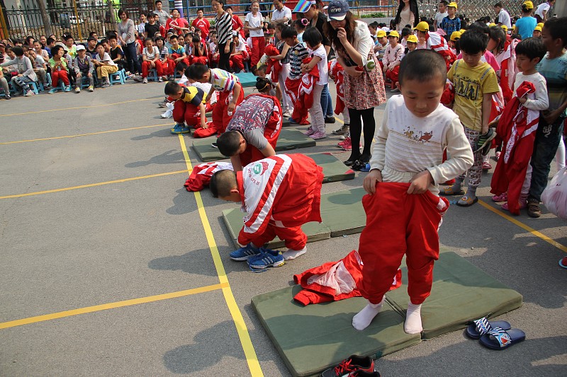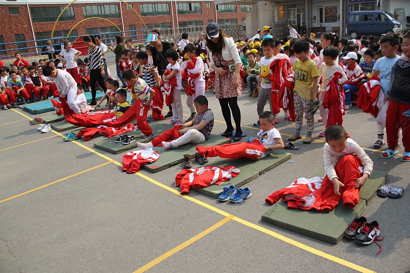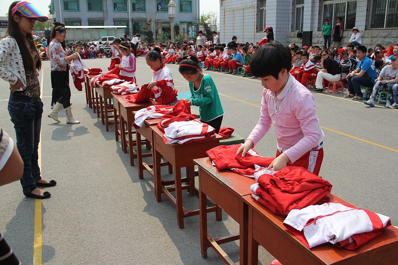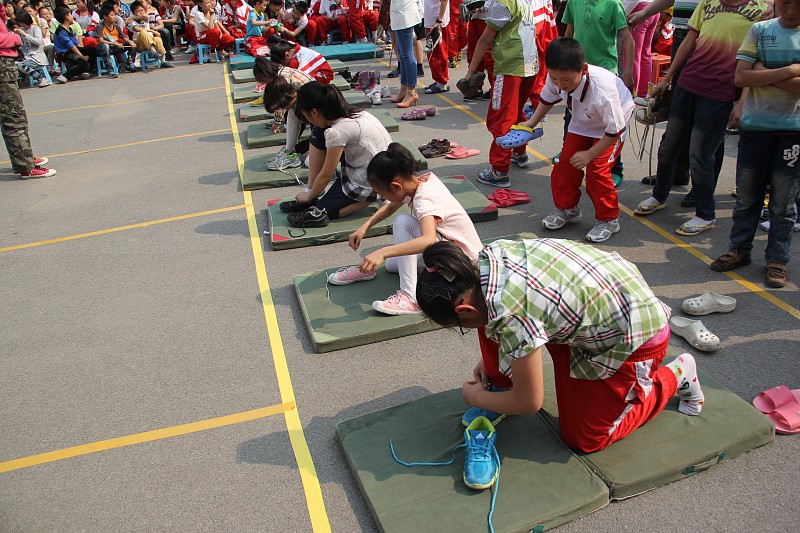 首先进行的是二年级的系红领巾、三年级的叠衣服和五年级的包书皮比赛。参赛选手们在规定的时间内,都较好地完成了比赛项目。尤其是五年级的同学们,把书皮包得非常精美。接下来进行的是一、二年级同学们的穿衣服比赛。看到低年级的小同学们穿衣服时的神情,真的很可爱!有的小同学看到别人已经跑到终点,也迫不及待地连鞋带还没有系好就奔向终点。最后进行制作水果拼盘和紧张激烈的运鸡蛋比赛。运鸡蛋实际是用筷子从一个小桶里夹出一个乒乓球运到十米外的另一个小桶里,在规定的时间内,全班共六名参赛选手运的乒乓球的总数最多者获胜。随着运鸡蛋比赛的结束,场外的水果拼盘也制作完毕。孩子们的比赛结束后,老师们也按捺不住兴奋的心情,学校又增加了教师运鸡蛋比赛。