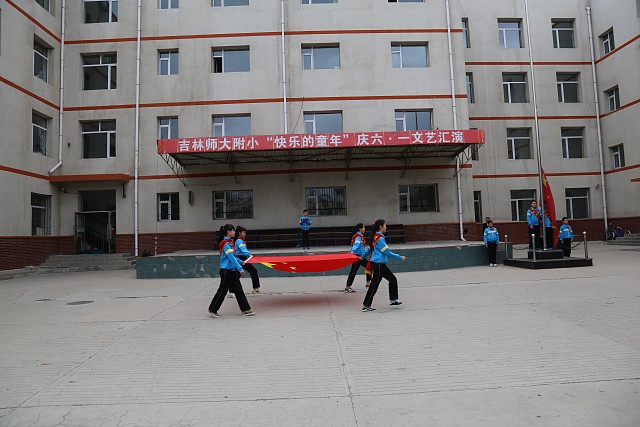 我宣布:吉林师大附中附小本学期第六次升国旗仪式现在开始!