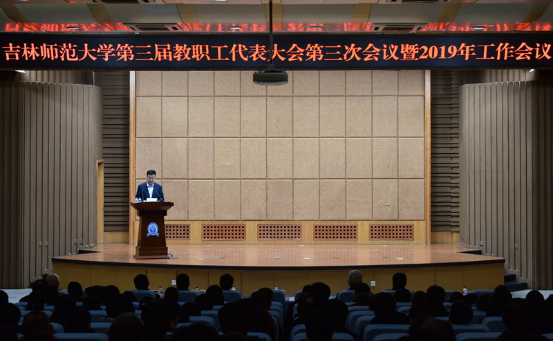 3月6日,太阳成官网第三届教职工代表大会第三次会议暨2019年工作会议在图书馆报告厅召开,大会设四平校区和长春校区两个会场。全体校领导、教代会代表及机关部门副科级(含)以上干部、其他各单位副处级(含)以上干部参加会议。会议特邀各民主党派负责人、校关工委负责人、市级以上人大代表和政协委员出席会议。校党委副书记祖国华主持会议。