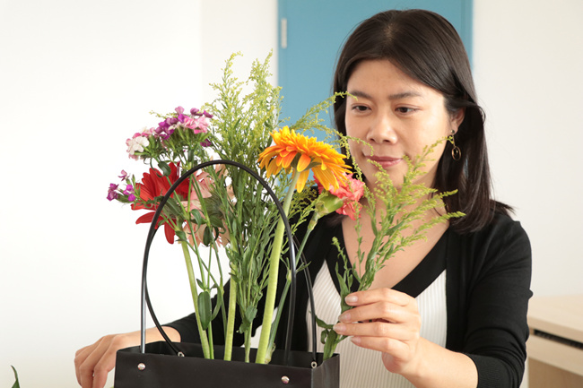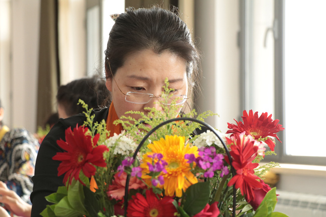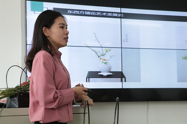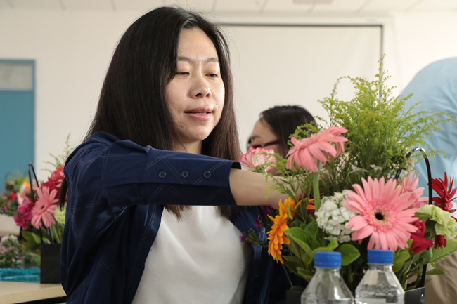 吴佳琳老师详细讲解了插花艺术的来源及其发展历史,介绍了中西方插花艺术特色、设计风格,并现场操作,细致展示了插花的具体流程。女教师们在吴佳琳老师的细心指导下,做出了多件插花作品,课堂花影流动,美不胜收