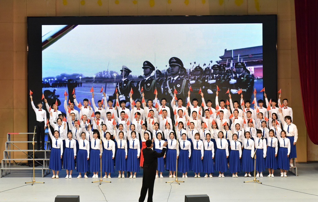 大赛在学校职工合唱团倾情演唱的歌曲《我爱你中国》中拉开帷幕。《我和我的祖国》《走进新时代》《走向复兴》《红旗飘飘》《共筑中国梦》,一首首主题鲜明、催人奋进的歌曲,唱出了全校师生不忘初心、牢记使命,永远跟党走,永远和祖国共命运的坚定决心。外国语学院合唱团朗诵慷慨激昂,歌曲明快悠扬,临近结尾的一声“我爱你,中国”更是抒发出祖国儿女对母亲的无比热爱。大学外语部合唱团以激情的朗诵和响亮的歌声表达对祖国70年光辉成就的满满自豪,展现了中国人民奋发进取,走向复兴的有力步伐。“五星红旗迎风飘扬,胜利歌声多么响亮……”经法学院合唱团用激情澎湃的歌声讴歌新时代,高擎的鲜艳国旗汇成了美丽的红色海洋,向中华人民共和国成立70周年华诞献礼。最后,大赛在校领导和全场师生《歌唱祖国》的嘹亮歌声中,在“亲爱的祖国,生日快乐”的深情祝福中圆满落幕。