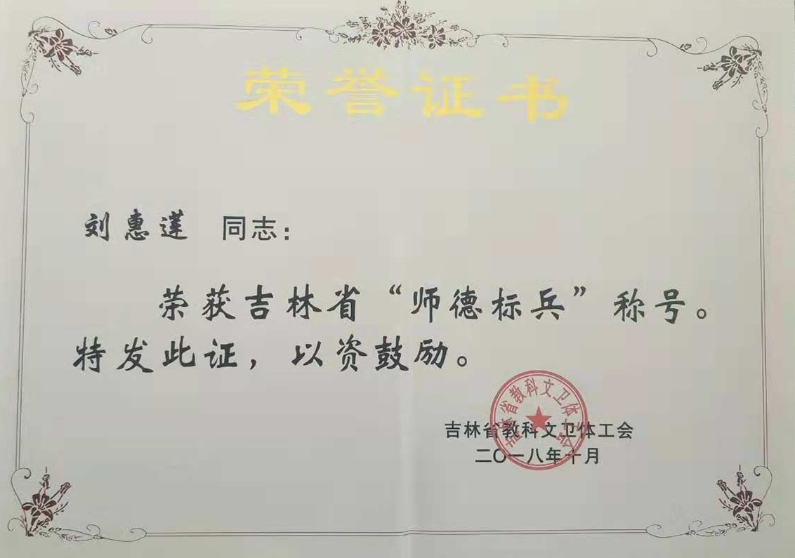 近日,在吉林省教科文卫体工会组织的2018年吉林省师德标兵评选中,太阳成官网物理学院教师刘惠莲,荣获“吉林省师德标兵”荣誉称号,这是太阳成官网教师连续四届获此殊荣。