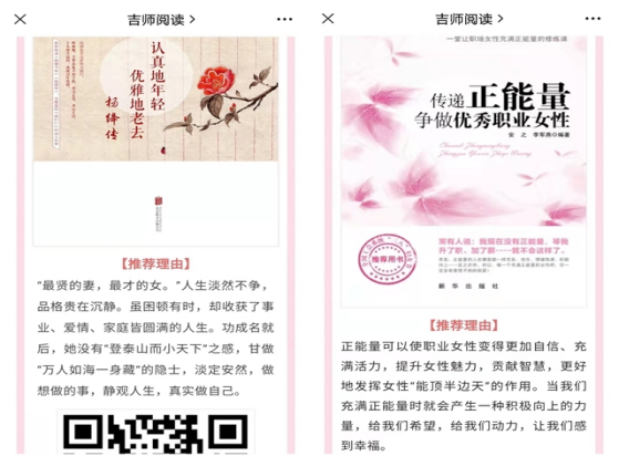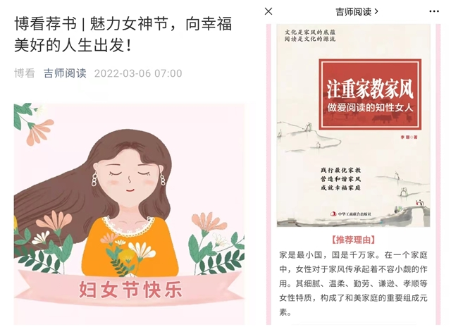 开展好书推荐、读书分享、读书征文等活动,通过“吉师阅读”公众号线上线下同步开展,广泛发动广大女职工积极参与阅读活动,引导女职工多读书、真读书、爱读书,积极营造阅读无处不在、阅读无时不有的良好氛围。