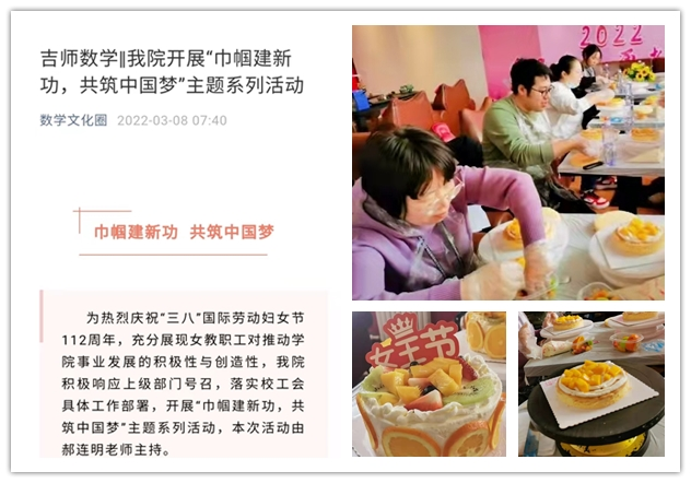 为庆祝第112个“三八”国际妇女节,学校面向全体女职工开展了“巾帼建新功共筑中国梦”主题系列活动,一是开展“玫瑰书香”女职工主题阅读活动,二是开展“亮家风传家教弘扬传统文化”活动,三是开展“美丽吉师魅力女性”女职工书画摄影展活动,四是开展“心灵手巧”手工艺作品展活动,五是开展“关爱女性身心健康”活动,六是开展丰富多彩的文体活动。通过系列活动,引导激励广大女教职工弘扬“四自”精神,在教育管理与创新、促进社会和谐中发挥半边天作用,以优异成绩迎接党的二十大胜利召开。