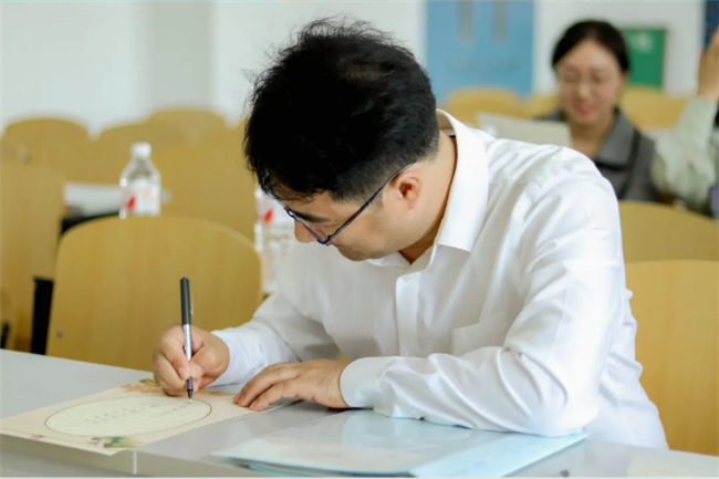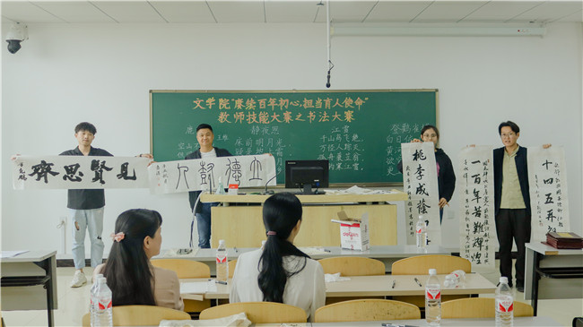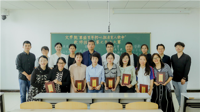 一尺讲台一亩田,种桃种李种春风。为热烈庆祝我国第37个教师节,激发教师活力,增强教师凝聚力,提高教师从业技能,引导文学院教师坚定使命,赓续教书育人初心,文学院工会组织文学院全体教师于9月8日14:00在双实教学楼 809教室举行“赓续百年初心 担当育人使命”教师技能大赛系列活动之书法大赛。文学院党委书记宋大伟、院长肖振宇、副院长李振峰、副院长李恒、工会主席赫亚红出席本次活动,文学院全体教师参加比赛。