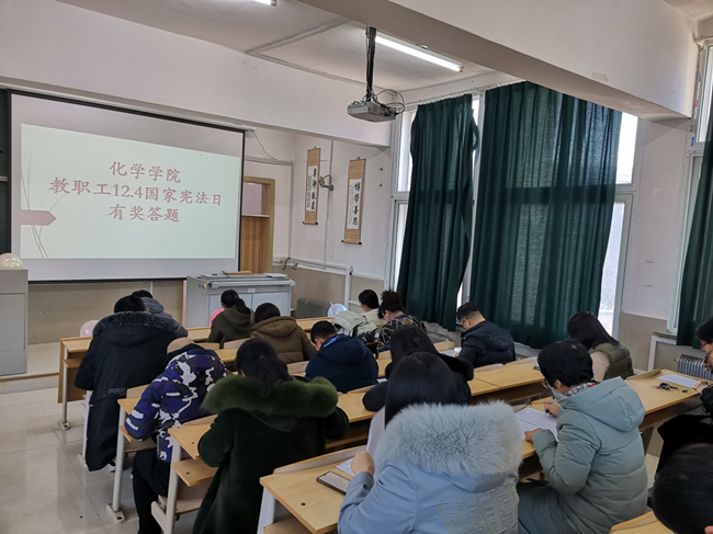 12月4日是“国家宪法日”,为弘扬宪法精神、维护宪法权威,化学学院工会于12月4日在第四教学楼第二阶梯教室开展了“12·4”国家宪法日有奖答题活动,四平校区学院领导班子、教职员工30余人参加了活动。
