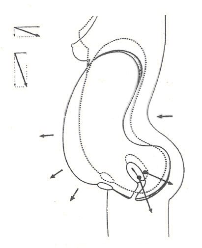 正常体位时,人体正常的生理弯曲使腹腔压力和盆腔脏器的重力轴指向骶骨 ;妊娠时,腰部向前突出,腹部向前鼓起,向下突出,使重力轴线向前移,而使腹腔压力和盆腔脏器的重力指向盆底肌肉,加上子宫重量日益增加,使盆底肌肉处在持续受压中,而逐渐松弛(如下图所示)。受妊娠生理变化的影响,盆底韧带也会在妊娠晚期因胶原溶解的增加变得松弛(以上文字和下图可清楚解析剖宫产产妇也需做盆底功能检查、康复训练)。分娩时,会阴裂伤、会阴侧切对盆底组织的损伤更直接:盆底肌肉纤维和筋膜的网状结构被撕裂,盆底神经也受到一定程度的损伤。如果产后护理不当,不及时进行盆底肌肉修复理疗、锻炼,或在盆底肌肉尚未恢复时加大腹压,比如便秘、干重活、提重物等,就很容易患上盆底功能障碍性疾病。