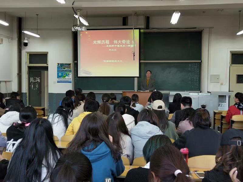为了扎实推进“不忘初心、牢记使命”主题教育,深入学习贯彻习近平新时代中国特色社会主义思想,培养爱国主义精神,形成良好的学习氛围。2019年10月16日下午,管理学院学生党支部在主教115教室开展“光辉历程、伟大奇迹”主题党日活动,本次活动特别邀请马克思主义学院周亚东教授为全体学生开设讲座,活动由管理学院学生党支部书记江超老师主持,17级所有预备党员和18级所有入党积极分子参加.