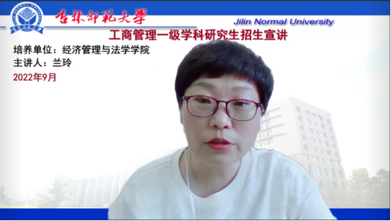 兰玲教授向同学们介绍了工商管理一级学科基本情况、专业方向和招生考试、学院学科建设总体情况等内容。
