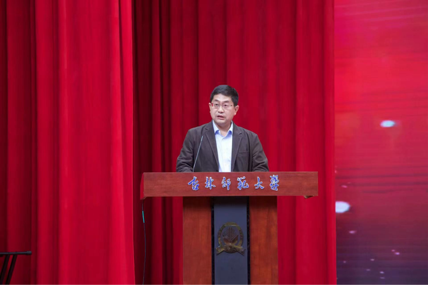 李琦院长代表学院全体师生致辞,对新同学的到来表示欢迎,他介绍四平是英雄的沃土,吉师是英雄的名片,经管法学院是充满活力、富有创新、追求卓越的学院。他鼓励2023级新生们从英雄城这片红色热土出发,与祖国和时代同频共振。