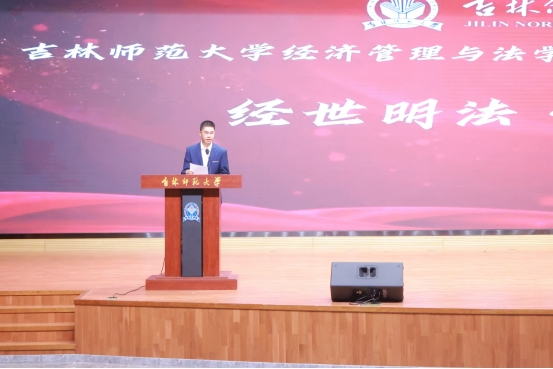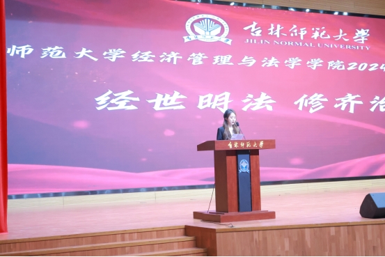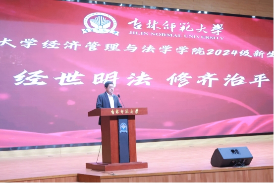 随着欢快的音乐声响起,经济管理与法学学院2024级新生开学典礼正式开始,李琦院长代表学院全体师生致辞,对新同学的到来表示热烈欢迎。