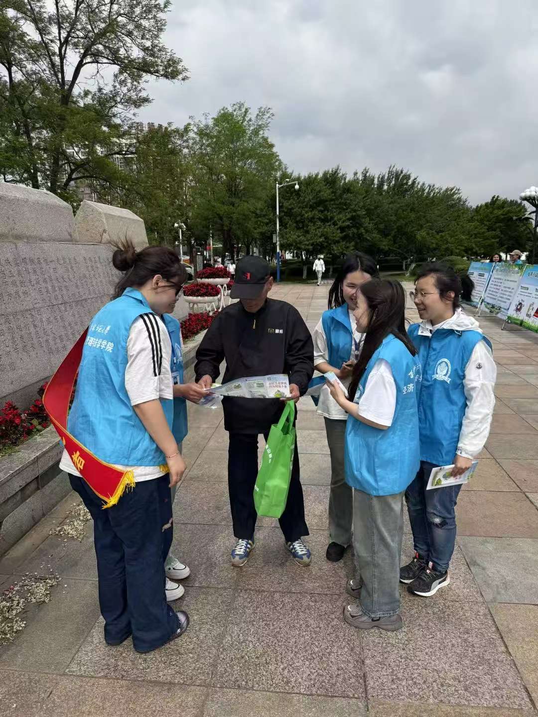 知识科普:志愿者们手持精心设计的宣传册,结合经管法专业视角,生动讲解“双碳”目标、生物多样性保护、垃圾分类新规。