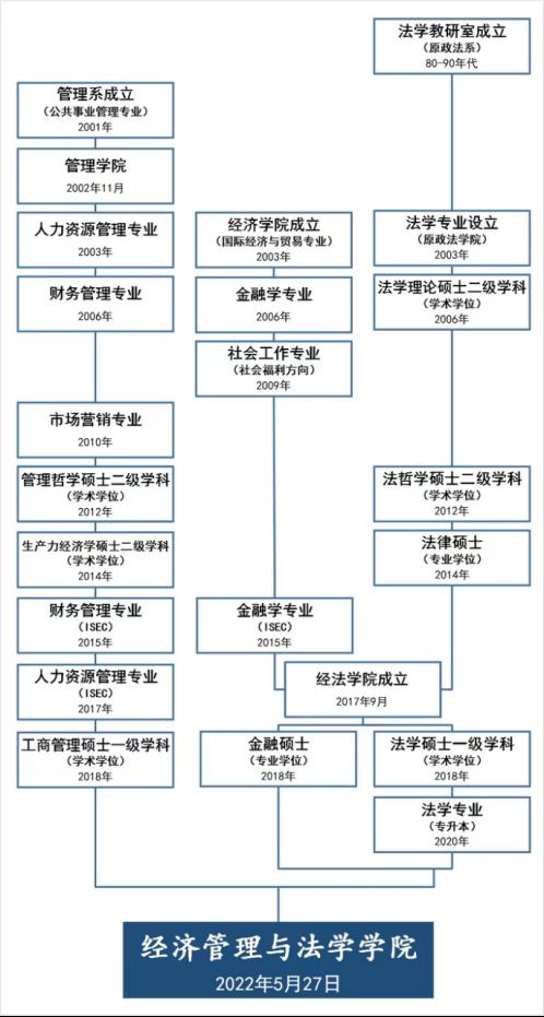 2022年5月27日,经法学院与管理学院合并,成立经济管理与法学学院。