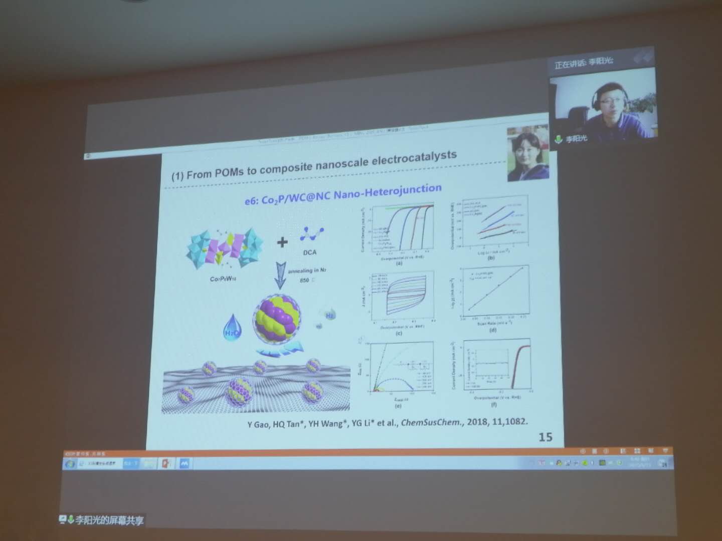 报告会上,李阳光教授从其所在实验室的研究特色出发,以多酸为研究对象,对多酸及多酸衍生材料在电催化水解析氢、二氧化碳还原、氮气还原三个方向中的应用做了系统介绍。李阳光教授研究的工作以应用为出发点,有针对性地对多酸材料结构进行设计和精准调控,在提高了材料本征催化活性的同时,引入协同催化机制,通过载体和催化剂之间的强相互作用,实现催化位点电子结构的调控,极大的提高了催化剂催化活性。在此基础上,通过原子匹配、近费米面能带中心调控、空间位阻效应等进一步实现催化剂的高选择性和高稳定性。李阳光教授的研究工作为多酸和多酸衍生催化剂的可控设计、合成奠定基础,其开发的系列催化剂及相关合成技术为二氧化碳还原、氯碱工业优化以及大规模工业产氢提供了技术保障。李教授丰硕的科研成果及其对催化科学的前瞻性和创新性,特别是其课题组在催化剂结构设计方面展现出的创新视角和巧妙构思,给与会师生留下了深刻印象。会后,实验室师生和李阳光教授进行了简短的讨论。针对各位老师和同学在催化材料选择,合成条件优化及催化剂构效关系方面的一系列问题,李阳光教授逐一进行了解答,实验室师生收获颇丰。