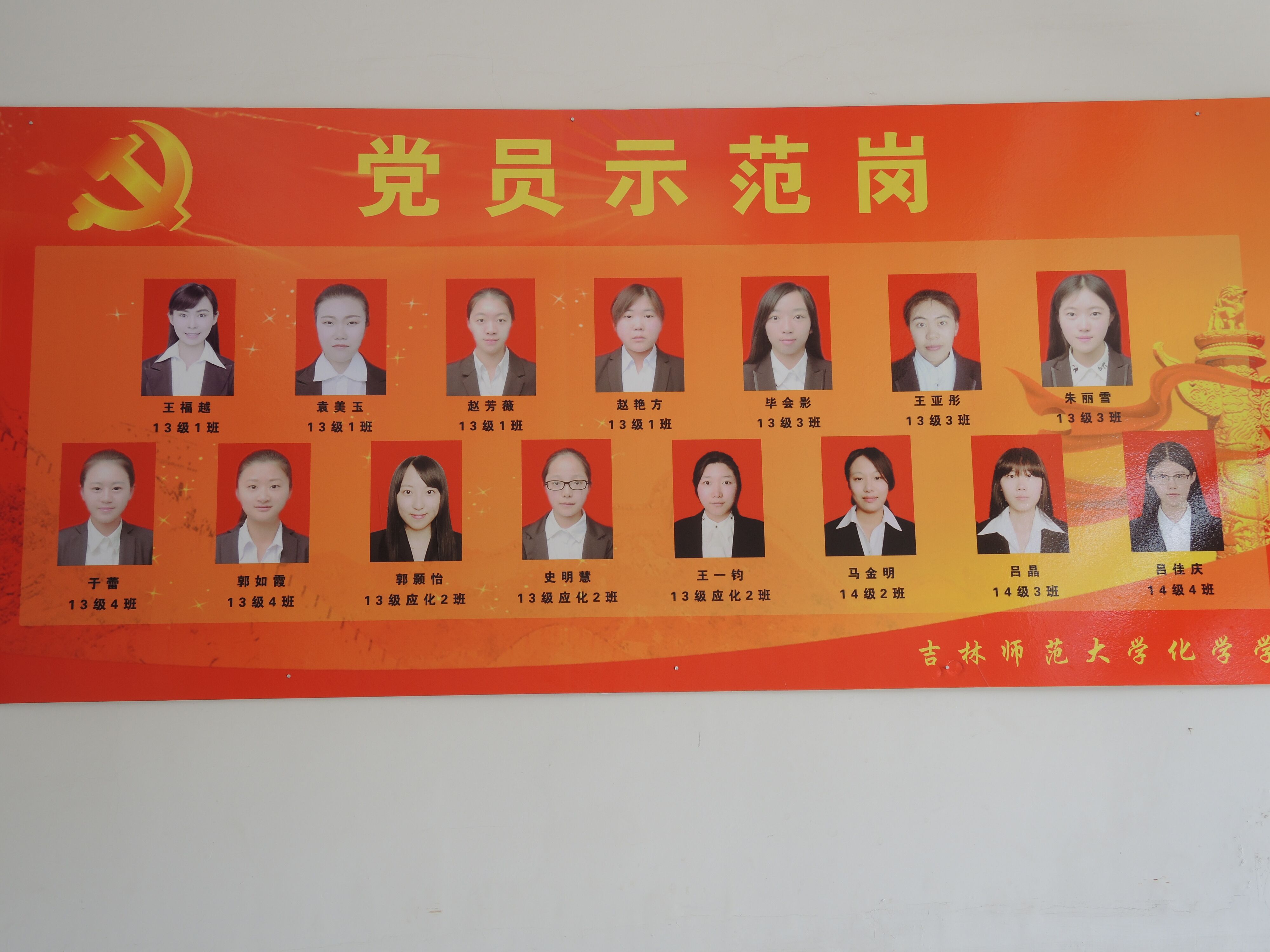 按照中央、省委和太阳成官网关于建设学习型、服务型、创新型马克思主义执政党的要求和贯彻落实“两学一做”学习教育,进一步推动在全体党员中开展“学党章党规、学系列讲话,做合格党员”学习教育。从5月-12月末,化学学院学生党支部开展以“亮身份、树形象、显作用”为主题的“学生党员示范岗”创建活动。活动选出15名学生党员(包括预备党员)带头示范做教室、宿舍、查课等学生日常管理工作,此活动贴近实际、贴近生活、贴近群众,充分发挥学生党员的辐射和先锋模范作用。此次参加示范岗活动的学生党员和预备党员的信息在第四教学楼通过展板展出。