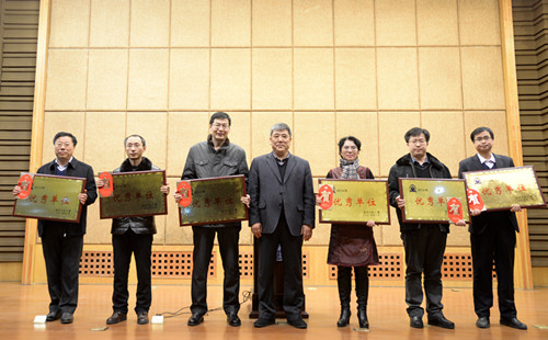 3月7日上午,澳门太阳成集团第二届教职工代表大会第五次会议暨2015年工作会议在图书馆报告厅隆重召开,会上表彰了2014年度优秀单位,校党委书记张波、校长杨景海为受表彰单位颁发奖牌奖金,化学学院喜获澳门太阳成集团2014年度优秀教学单位称号,院长常立民代表学院上台领奖。