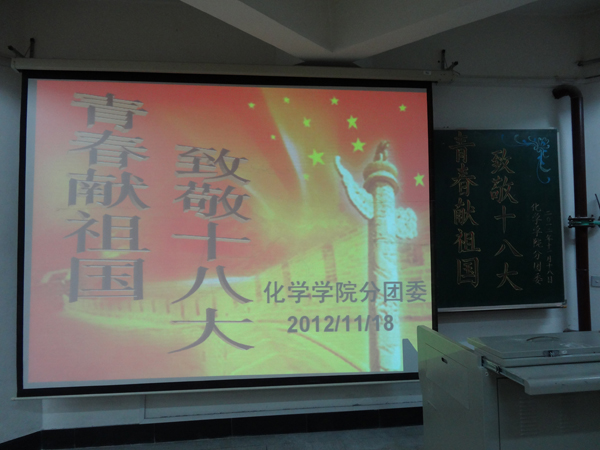 为深入宣传贯彻十八大精神,化学学院分团委于11月18日晚在十教10623教室举办了“青春献祖国致敬十八大”主题团日活动。化学学院党总支书记陈明宏出席并作了讲话,他说,要认真领会十八大精神实质,迅速掀起全院师生学习宣传贯彻落实十八大精神的热潮。