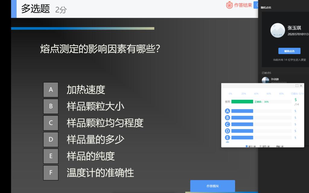在《有机化学实验》教学课堂中,虽然缺乏对了真实操作的体验感,但是通过微瑞平台的虚拟仿真实验,能够更大程序的进行训练,感官触觉虽然稍微欠缺,但是,实验操作风险,还能够学习相对标准的实验操作。相对充裕的教学时间,可以增加一些教学过程,利用雨课堂腾讯会议,方便师生云上互动交流,更多的教学环节,点名方式等,增加课堂的趣味性,提升学生学习乐趣。