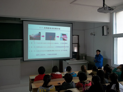 朱恩伟老师详细介绍了太阳能电池的发展历程,几种典型太阳能电池的组成、工作机理、性能等。大量的信息、抽象的概念、复杂的曲线图等,让同学们感受到科学的魅力。