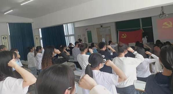 活动中学生党支部书记孟令权带领大家重温入党誓词,大家高举右拳,面向鲜艳的党旗庄严宣誓,全体党员向党表示了为共产主义事业献身的决心。