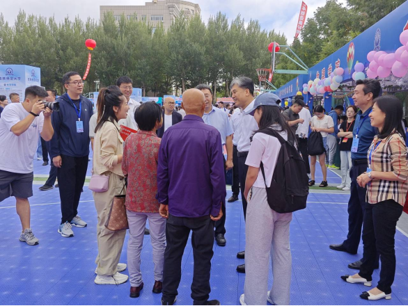 在篮球场报道处,党委书记王喜库、校长杨小天等校领导亲临现场,慰问广大迎新工作人员,并与新生及家长亲切交流。