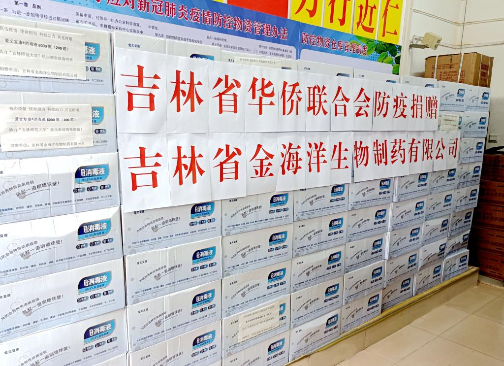 3月28日,由吉林省华侨联合会发起,吉林省金海洋生物制药有限公司向太阳成官网捐赠200箱6000瓶消毒液,价值57.6万元。学校和企业严格落实疫情防控要求,实现了防疫物资的转运与存放。