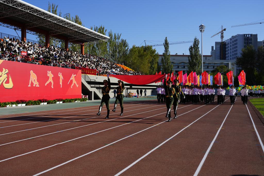 21日8时,在雄壮的运动员进行曲中,校国旗班护卫着鲜艳的五星红旗入场,旗海队、彩球队、裁判员及运动员方队依次走过主席台接受检阅。着装统一、步伐整齐、气势高昂的运动员用响亮的口号展现了师生的朝气。随后,举行了庄严的升旗仪式。